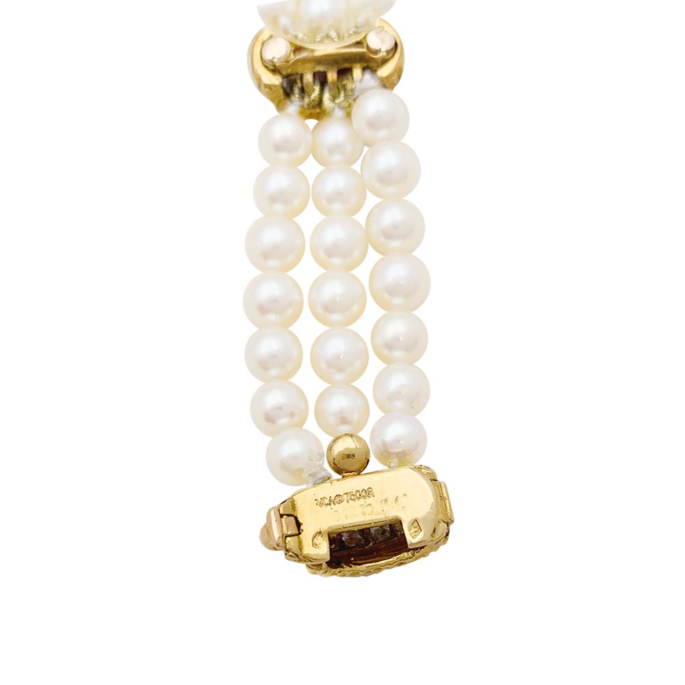 Un bracelet signé de la Maison Van Cleef & Arpels composé de trois rangs de perles de culture ponctués de cinq motifs en or jaune et or blanc 18 carats texturé sertis de diamants taille brillant.
