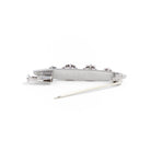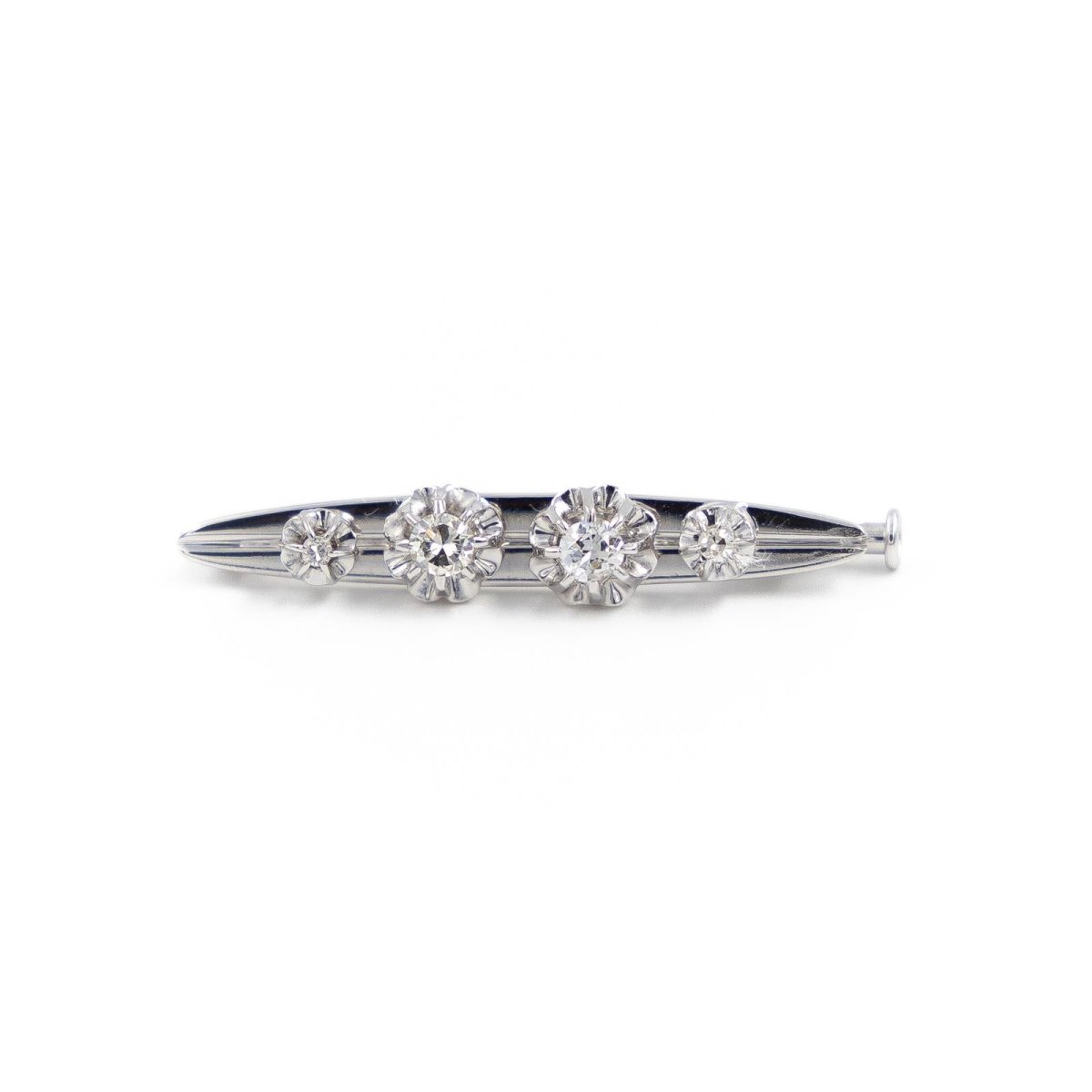 Broche en or blanc 750 millièmes (18 carats). sertie de 4 diamants. dont 2 de taille brillant d'environ 0.15 ct chacun. et 2 diamants de taille ancienne d'environ 0.02 ct chacun. poids total estimé des diamants: 0.34 ct. Longueur: 3.55 cm. Largeur: 0.62 cm. Poids total: 4.04 g. Poinçon hibou. Excellent état