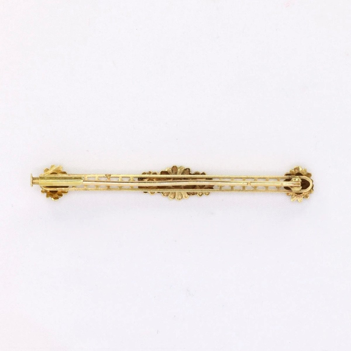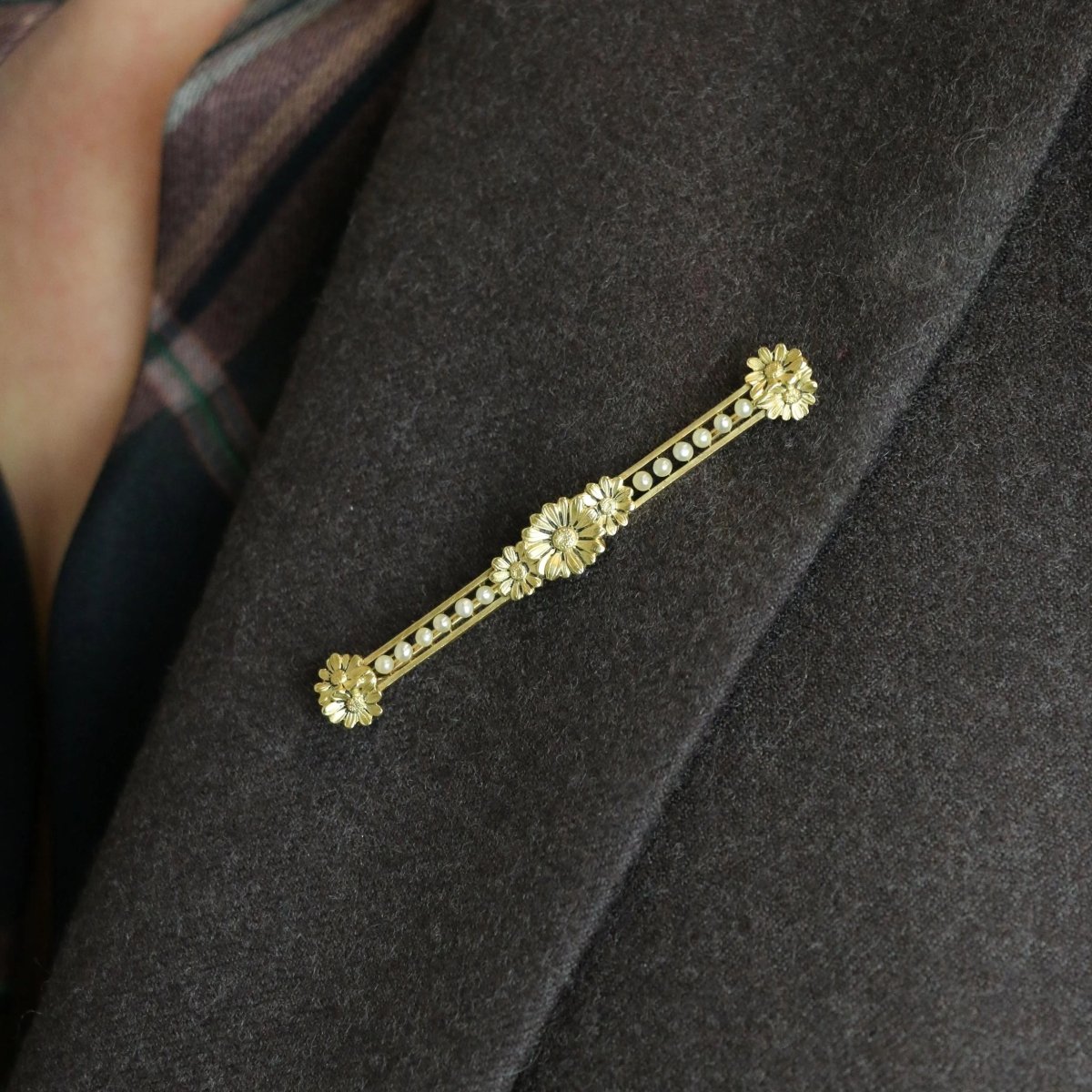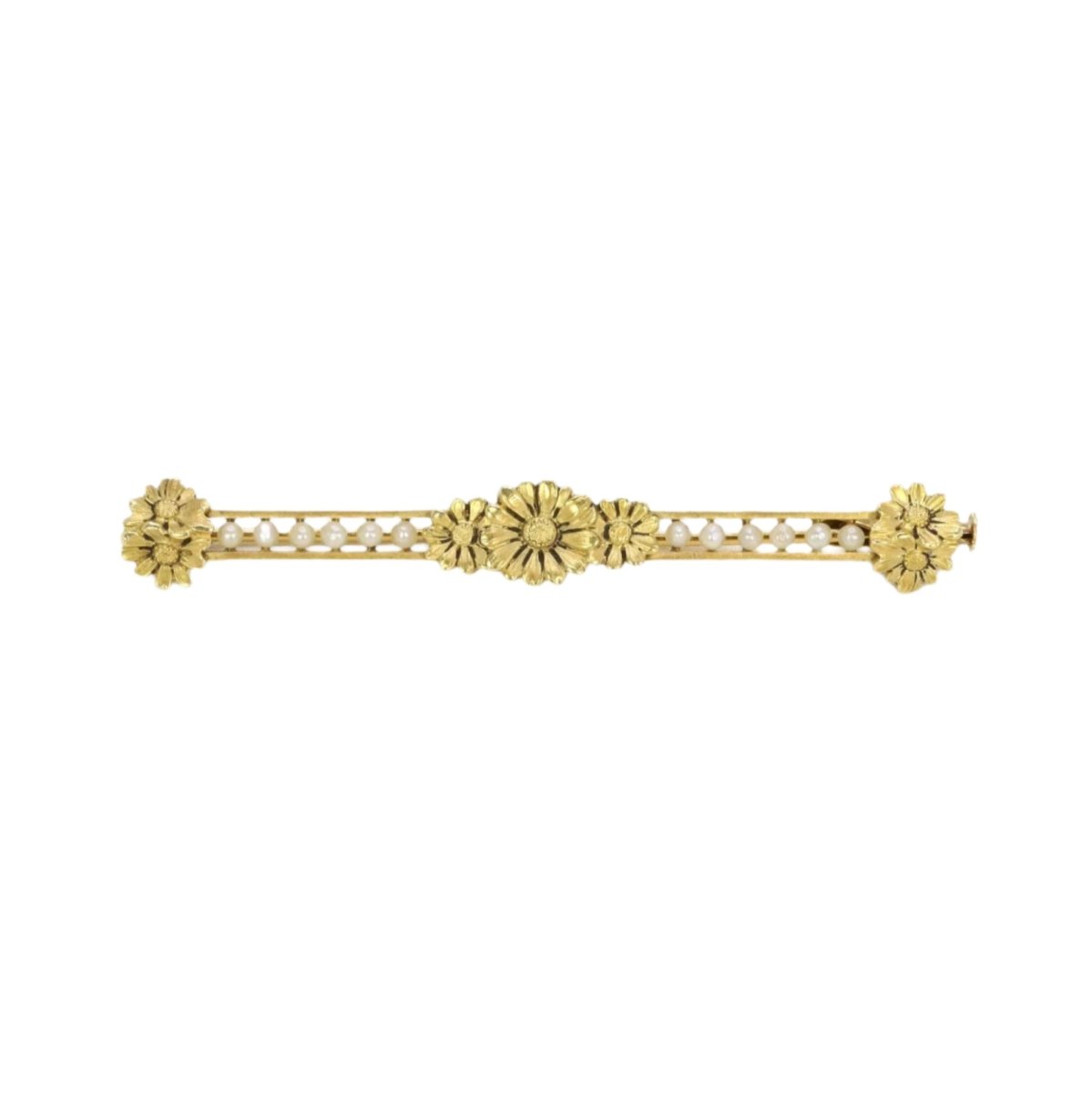 Broche-barrette en or 18k (750°/°°) composée d’une ligne centrale de petites perles fines et de motifs de marguerites finement ciselées aux extrémités et au centre. Travail français Art Nouveau circa 1900. Présence du poinçon tête d’aigle pour l'or 18 carats et trace de poinçon de fabricant français.Longueur : 6 cmLargeur : 0,8 cmPoids brut : 5,40 grammes
