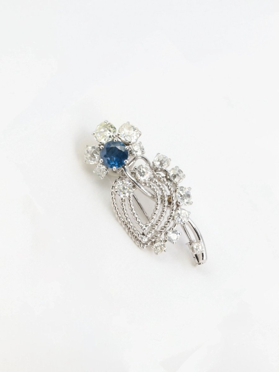 Broche ancienne MAUBOUSSIN saphir diamants Broche en or blanc 18k (750°/°°) figurant une fleur sertie en son centre un saphir pesant environ 1,7 ct et d’une chute de diamants taille ancienne Old mine cut pour un poids d'environ 3 carats, le plus important pesant environ 0,7ct. Dimensions 4,4cm x 2cmPoids brut : 11,81 grammes