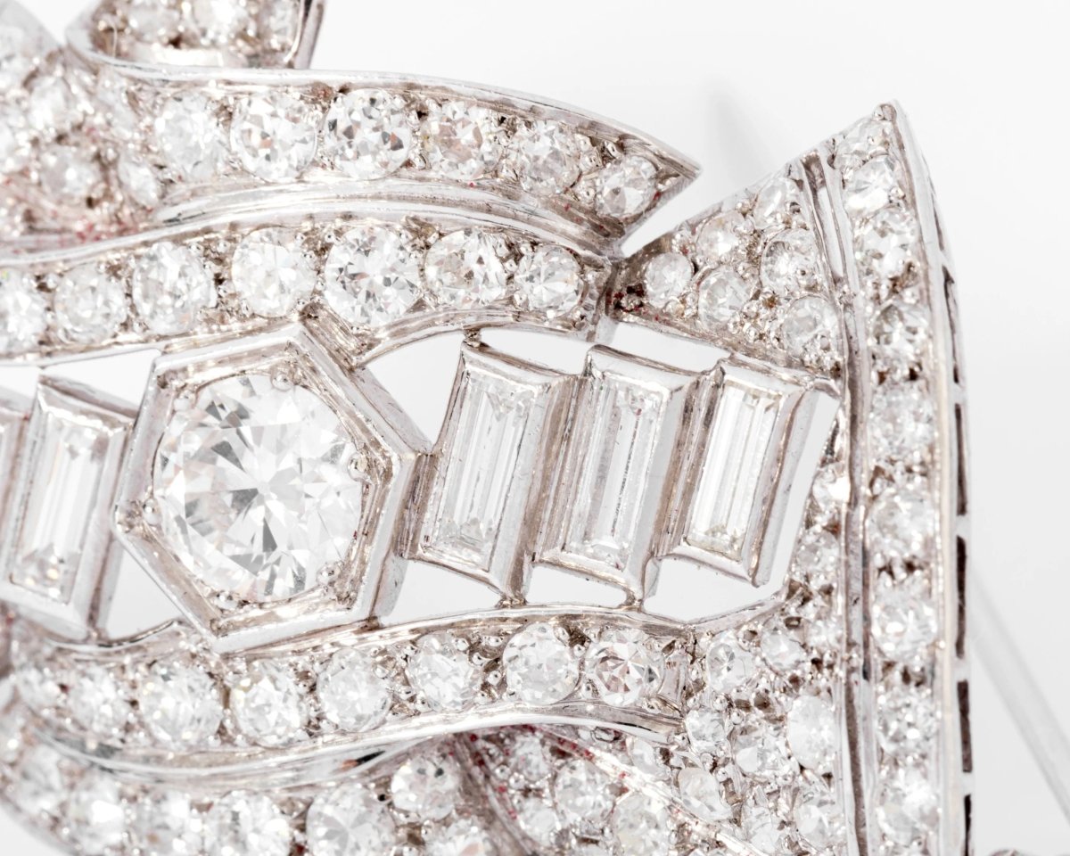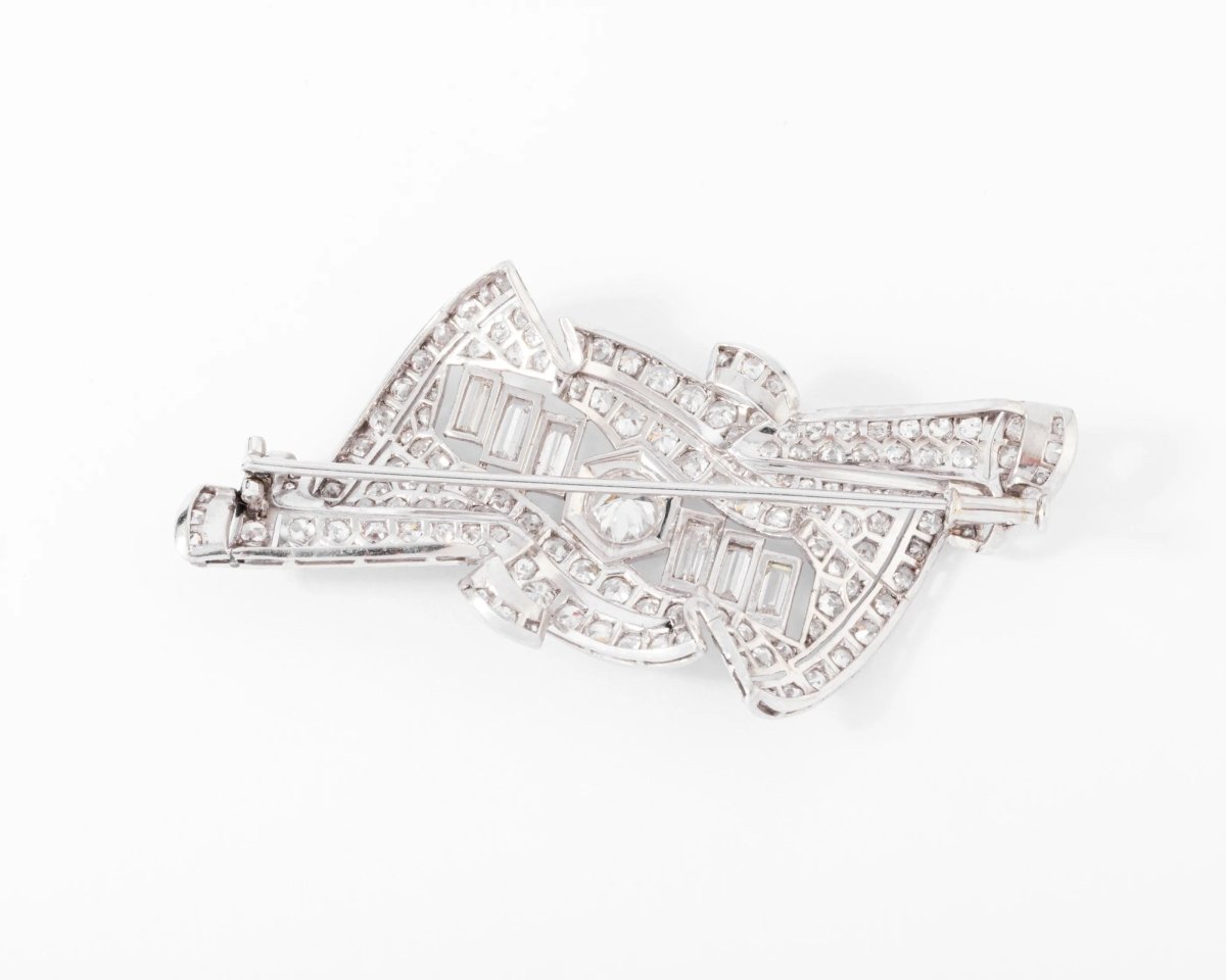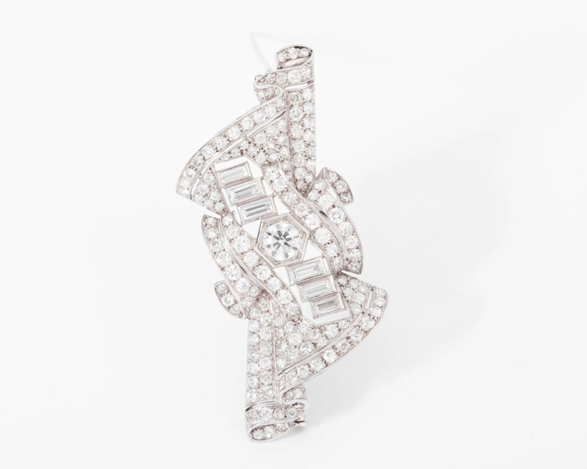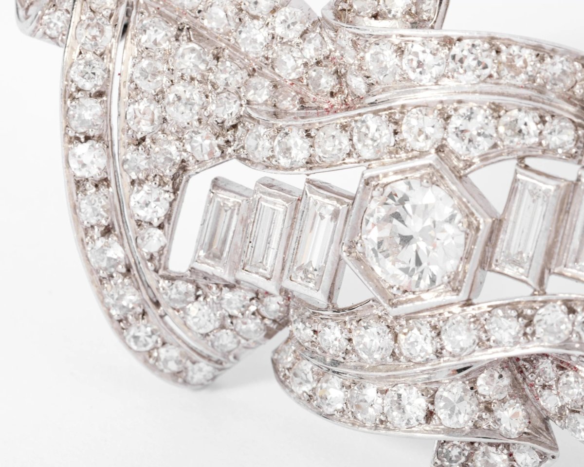 Broche en diamant des années 1930 formant une ganse ornée de diamant taille ancienne avec diamant taille baguette et diamant taille ancienne. Matière :Platine et or gris Poinçon : Tête d'aigle et tête de chien Poids :20grs Longueur : 6 cm Largeur : 3 cm Nombre carat: 6 cts Nombre de pierres: Période: 1930
