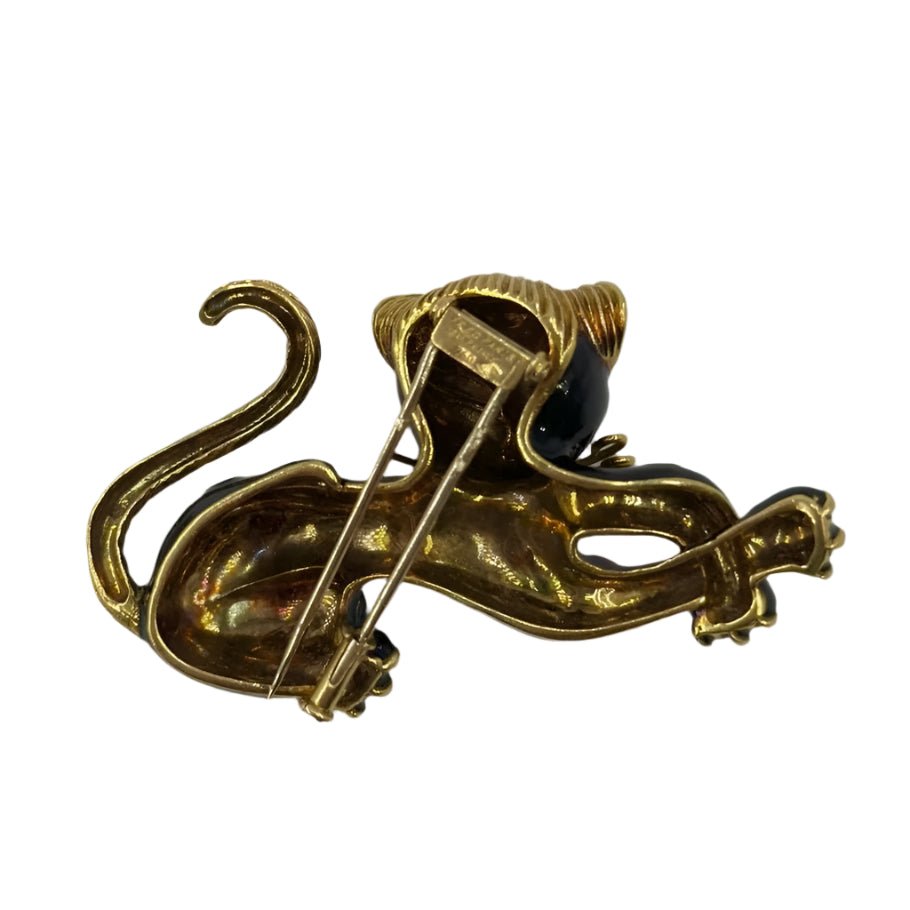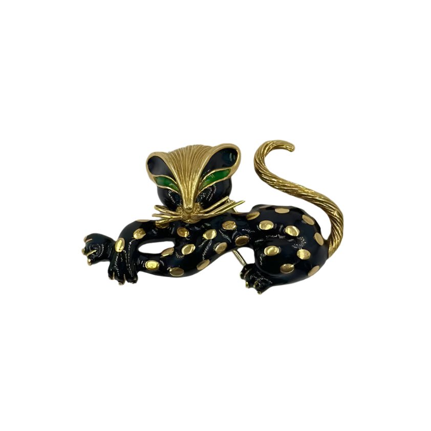 Broche FRED "Panthère" à la tête et à la queue texturées en or jaune 18 carats, les yeux et le corps ornés d’émail vert et noir, rehaussés de taches dorées. Système à clip.