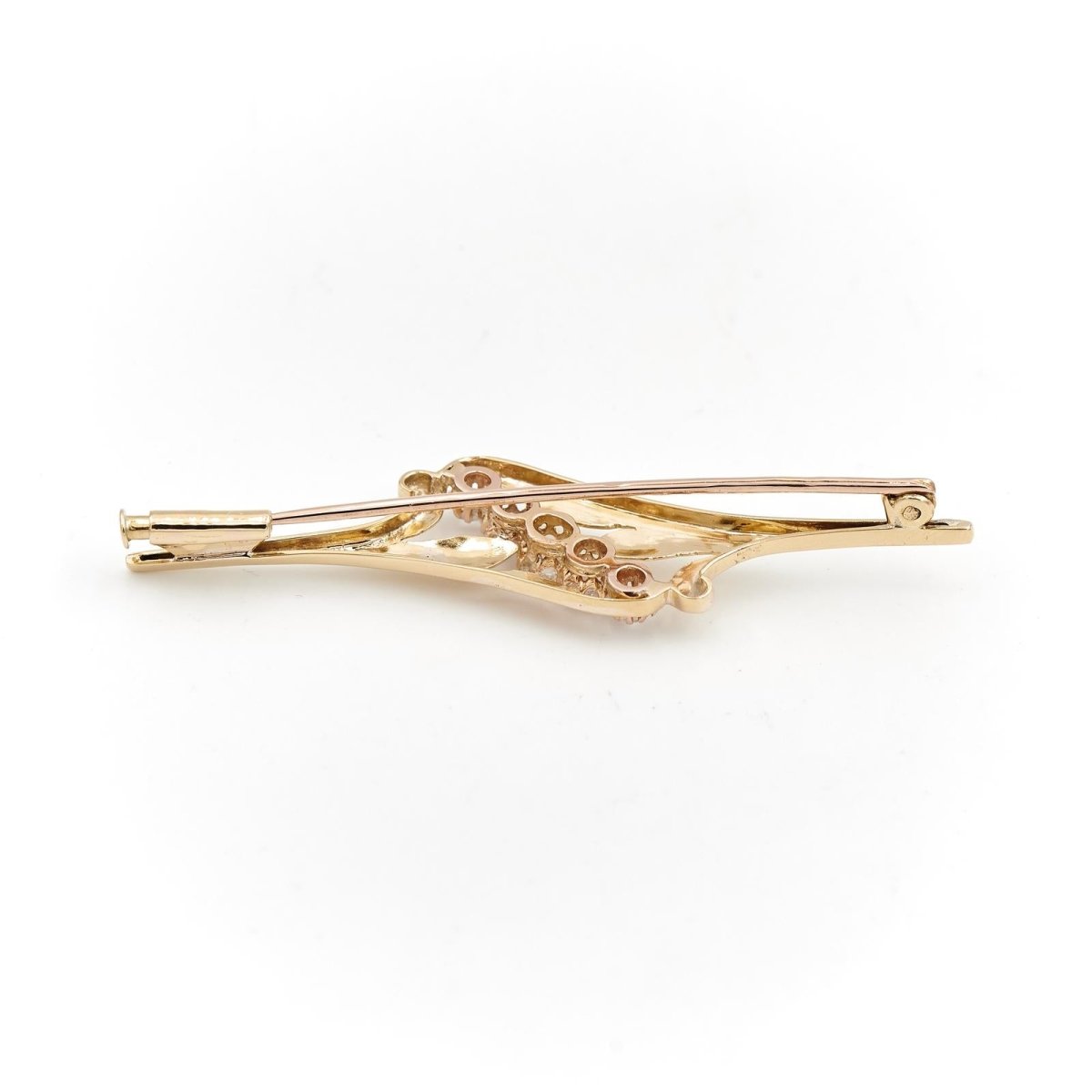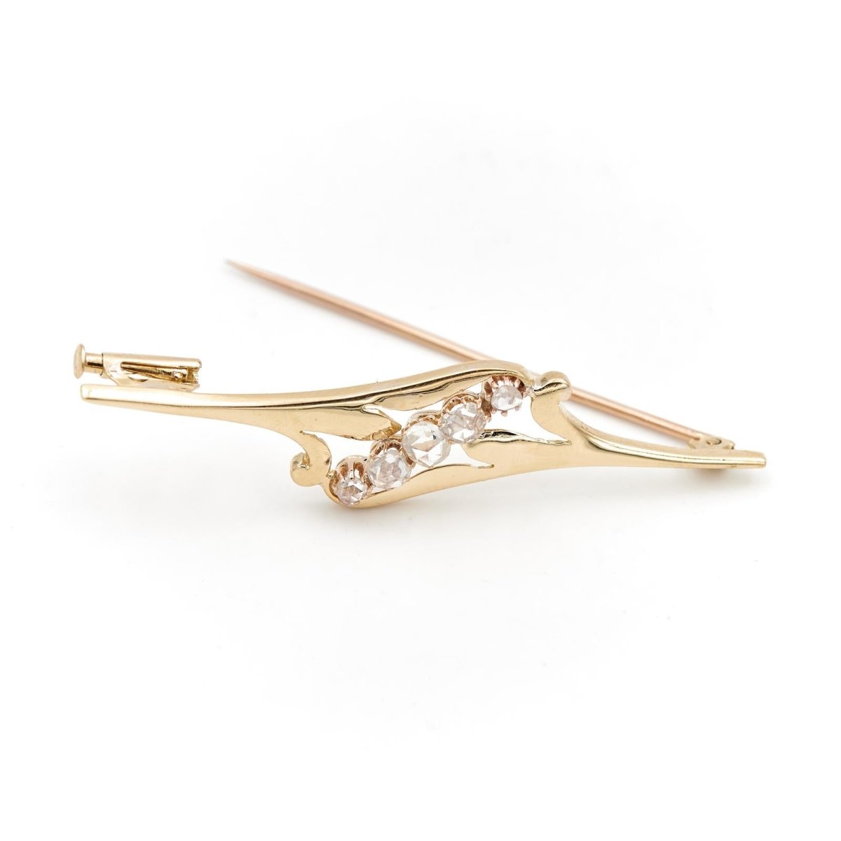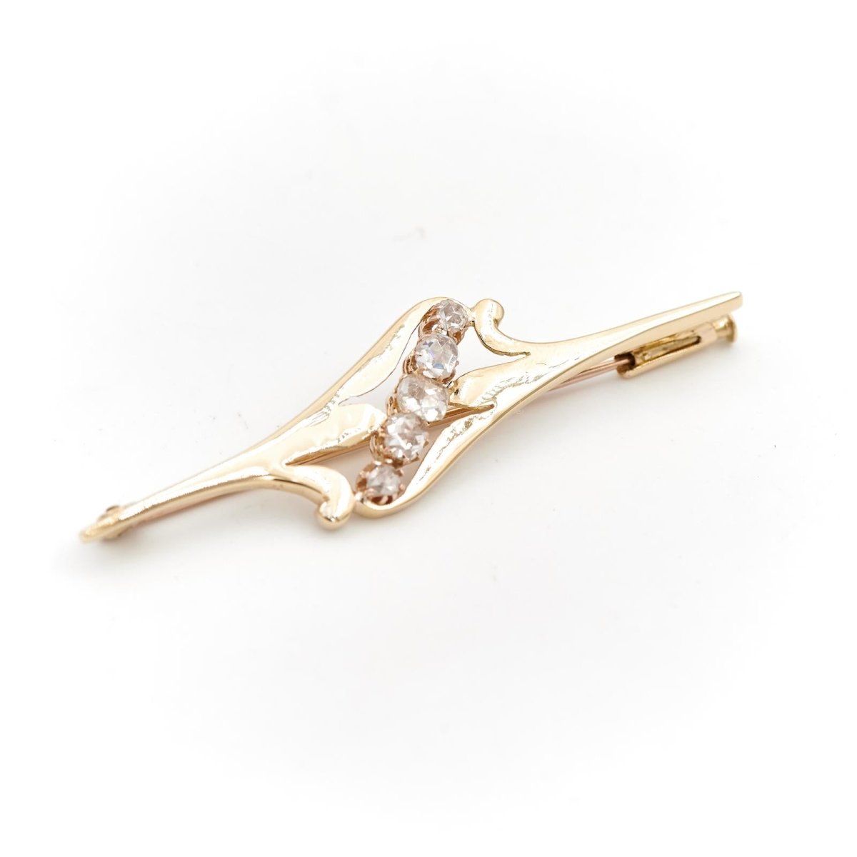 Broche diamants en or jaune 750 millièmes (18 carats). sertie de 5 diamants taille rose. au centre 1 diamant d'environ 0.21 ct. épaulé par 2 diamants d'environ 0.13 ct chacun. épaulé par 2 diamants d'environ 0.065 ct chacun. poids total diamants: 0.6 ct environ. dimensions: 5.46 cm X 1.43 cm. poids total: 3.62g. poinçon Hibou. excellent état.