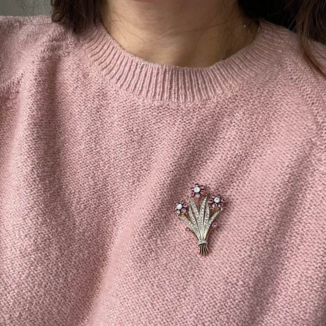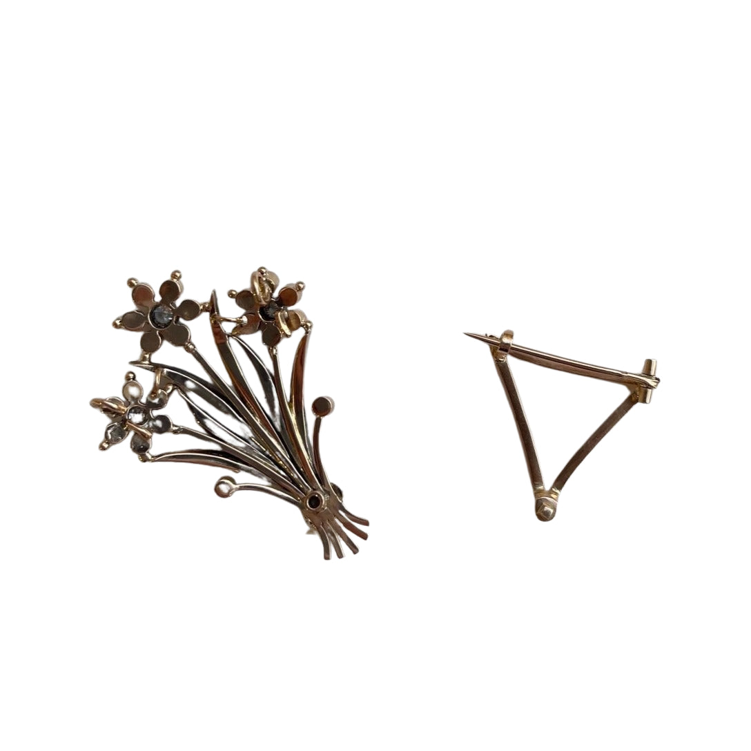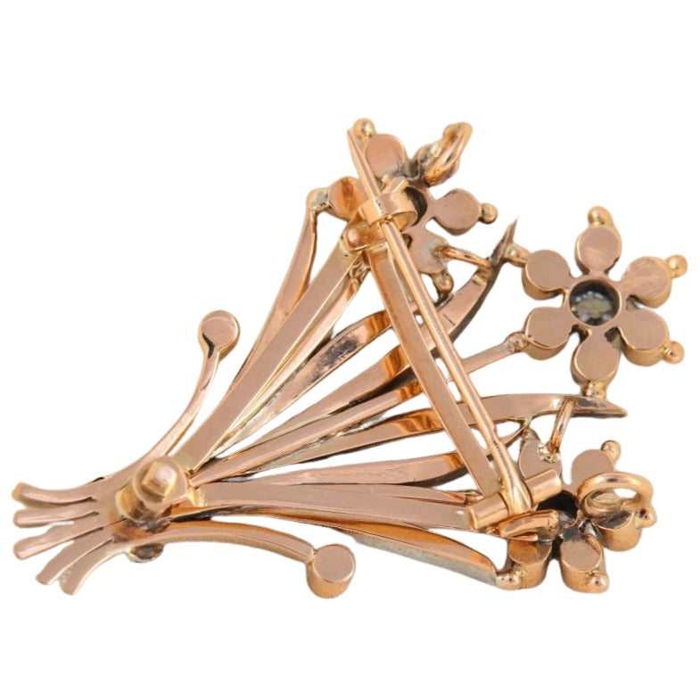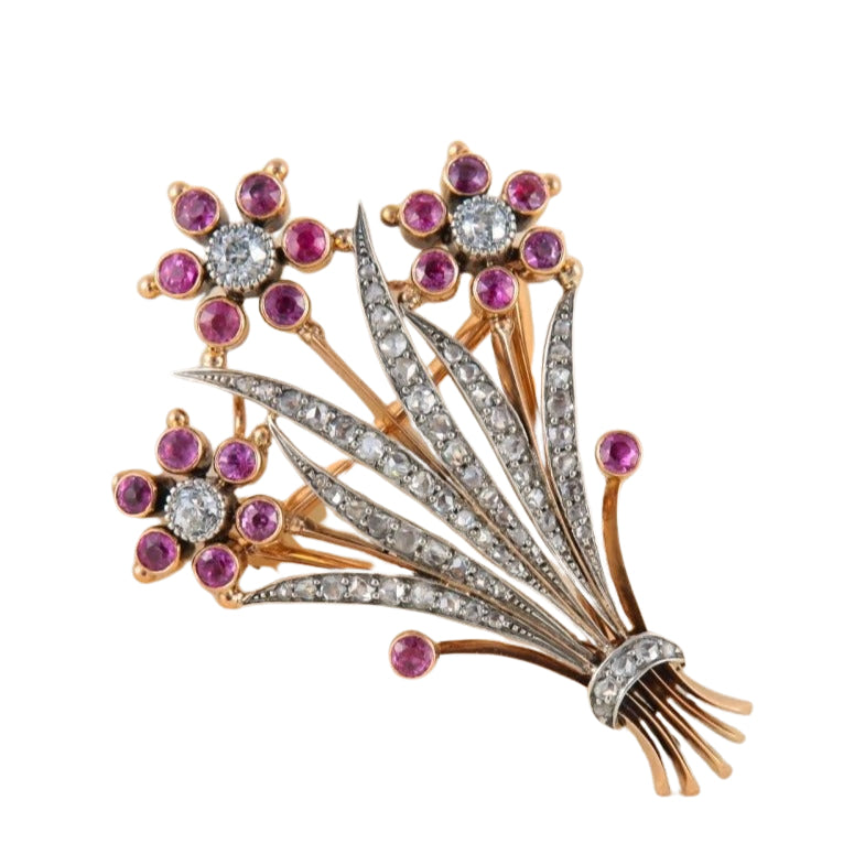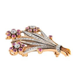 Broche-pendentif en or rose 18k (750°/°°) et argent figurant un bouquet de fleurs. Les feuilles serties de diamants taillés en rose et les trois fleurs d’un diamant taille ancienne en serti clos. Les fleurs sont entourées par des rubis taillés en brillant.Très joli travail de belle facture, le mécanisme permettant de porter le bijou en broche est démontable.Travail français des années 1910. Présence d'un poinçon mixte hibou et cygne. Poids Brut : 16,81 grammes