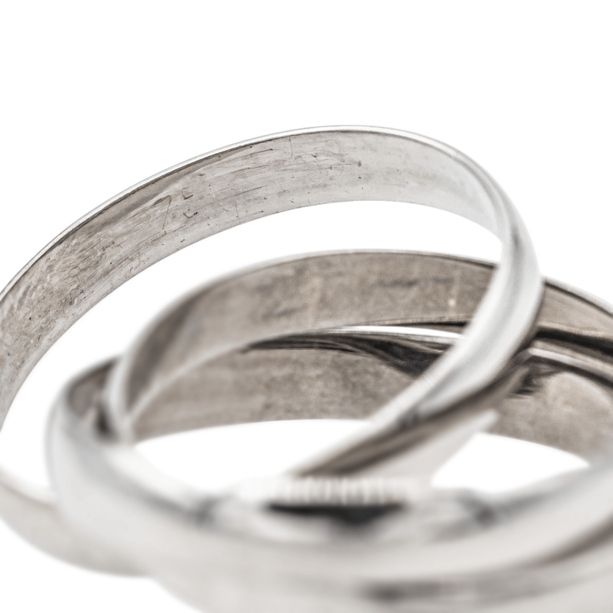 Bague signée de la Maison Cartier en or blanc 750 millièmes (18 carats). modèle Trinity. largeur d'un anneau : 0.29 cm. tour de doigt : 48. poids total : 5.02 g. poinçon tête d'aigle. numérotée. excellent état
