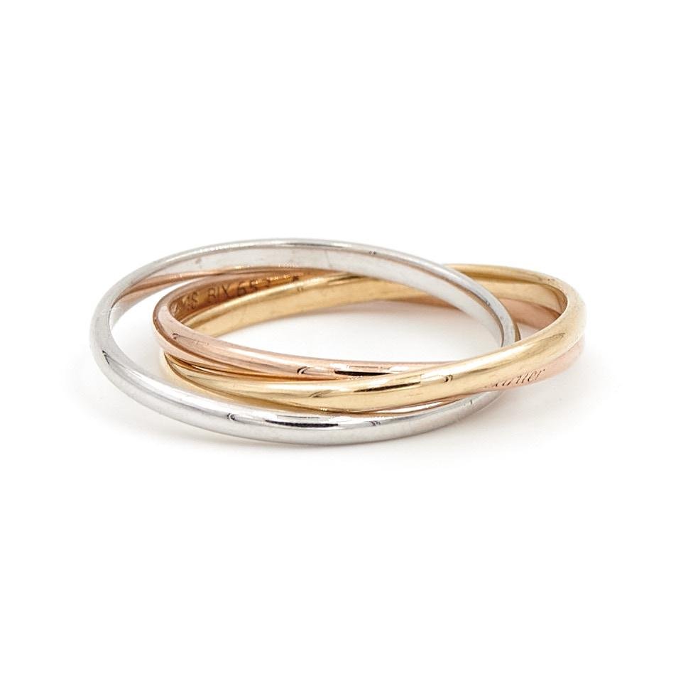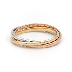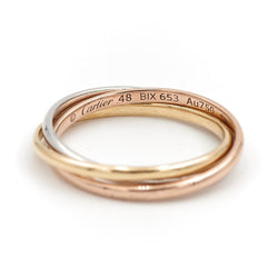 Bague signée de la maison Cartier en or jaune. blanc et rose 750 millièmes (18 carats) testé. modèle Trinity. largeur des anneaux : 0.12 cm. tour de doigt : 48. numéroté : BIX653. poids total : 2.67 g. excellent état