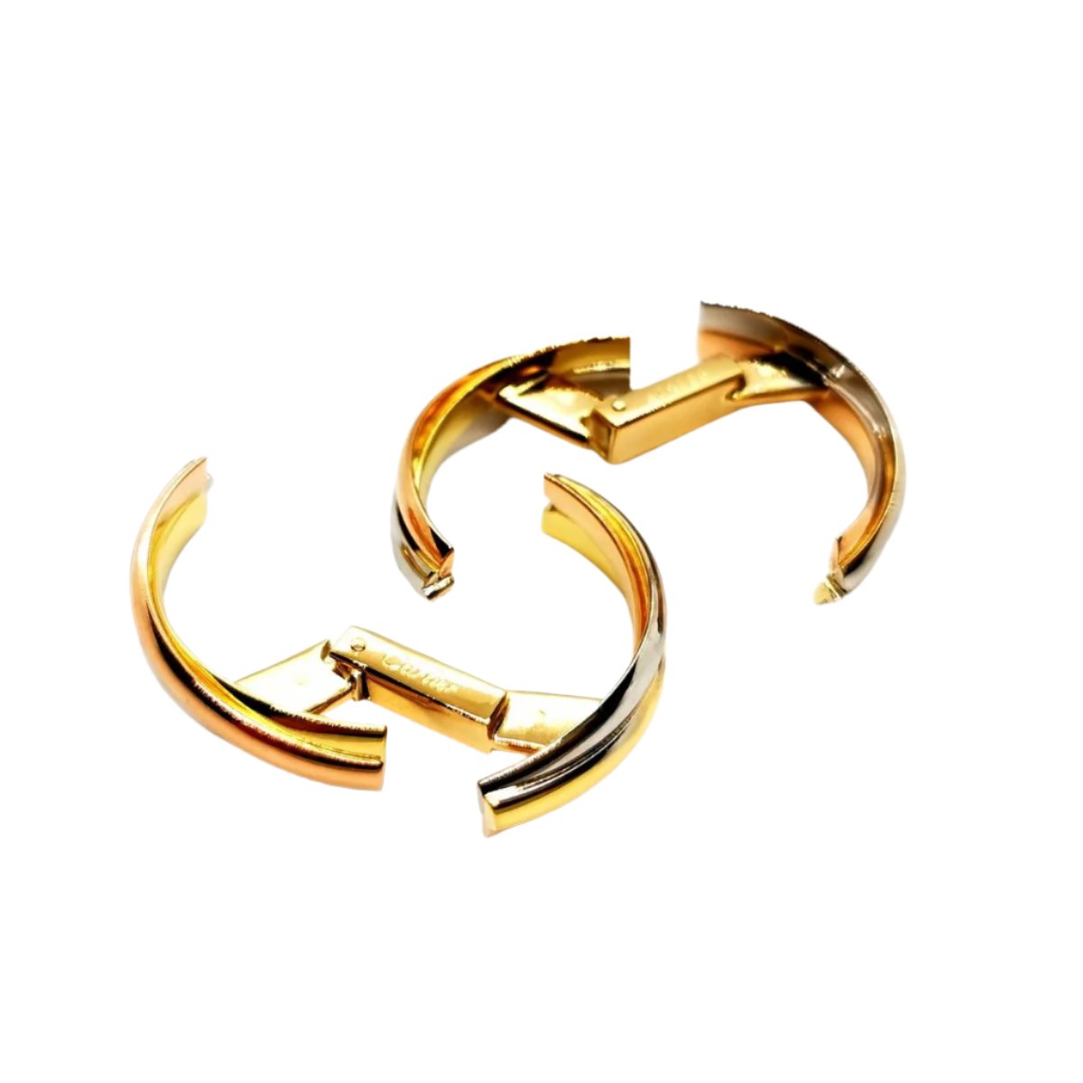 Boutons de manchette signés de la maison Cartier. collection Trinity. en or 750 millièmes (18 carats). or jaune or rose et or blanc. dimensions: 2.46 cm x 0.56 cm. poids total: 16.23 g. poinçon tête d'aigle. signés et numérotés. pochette Cartier. excellent état