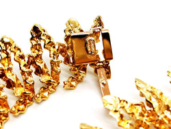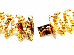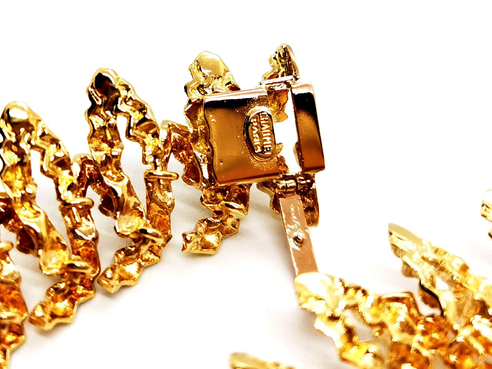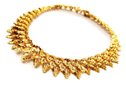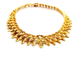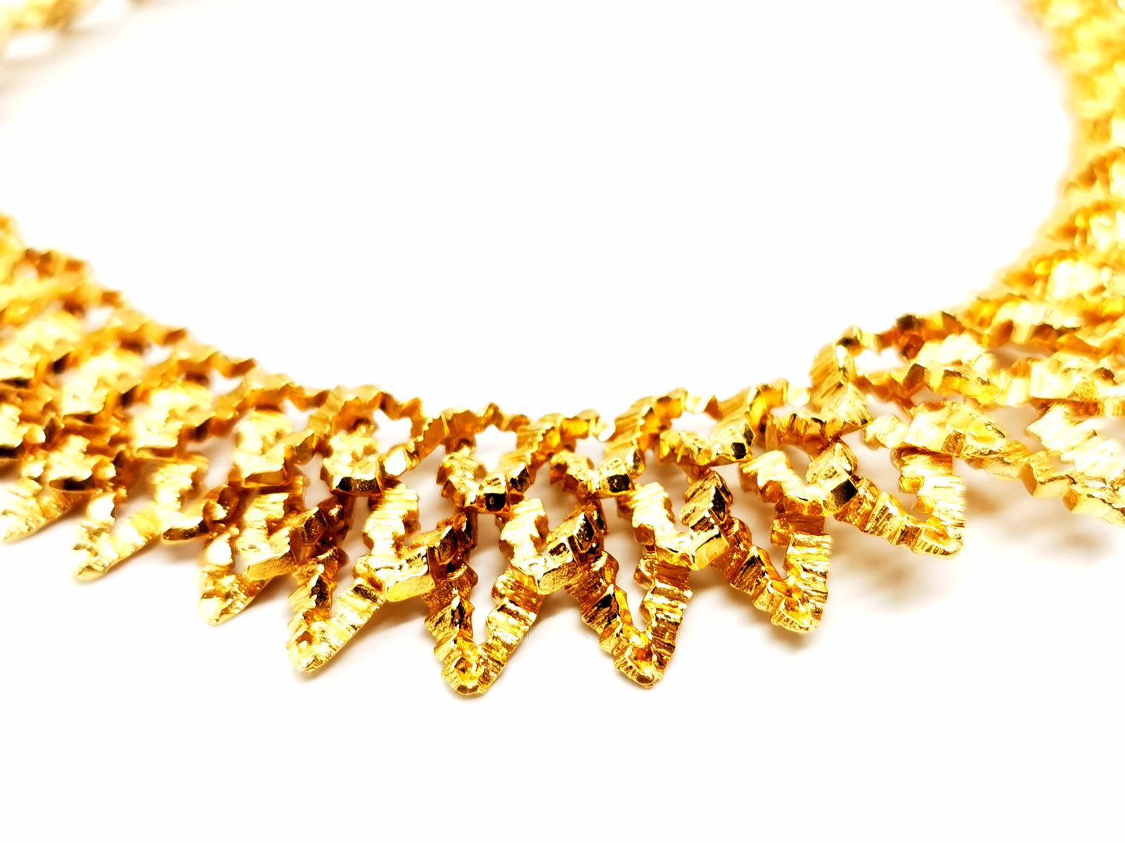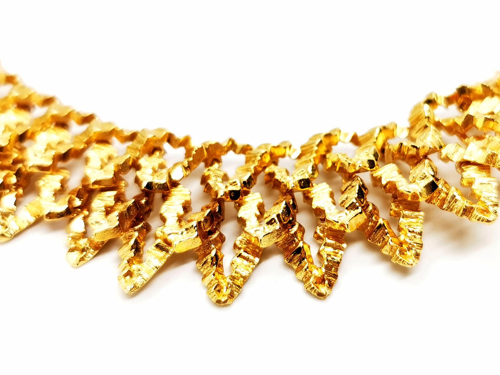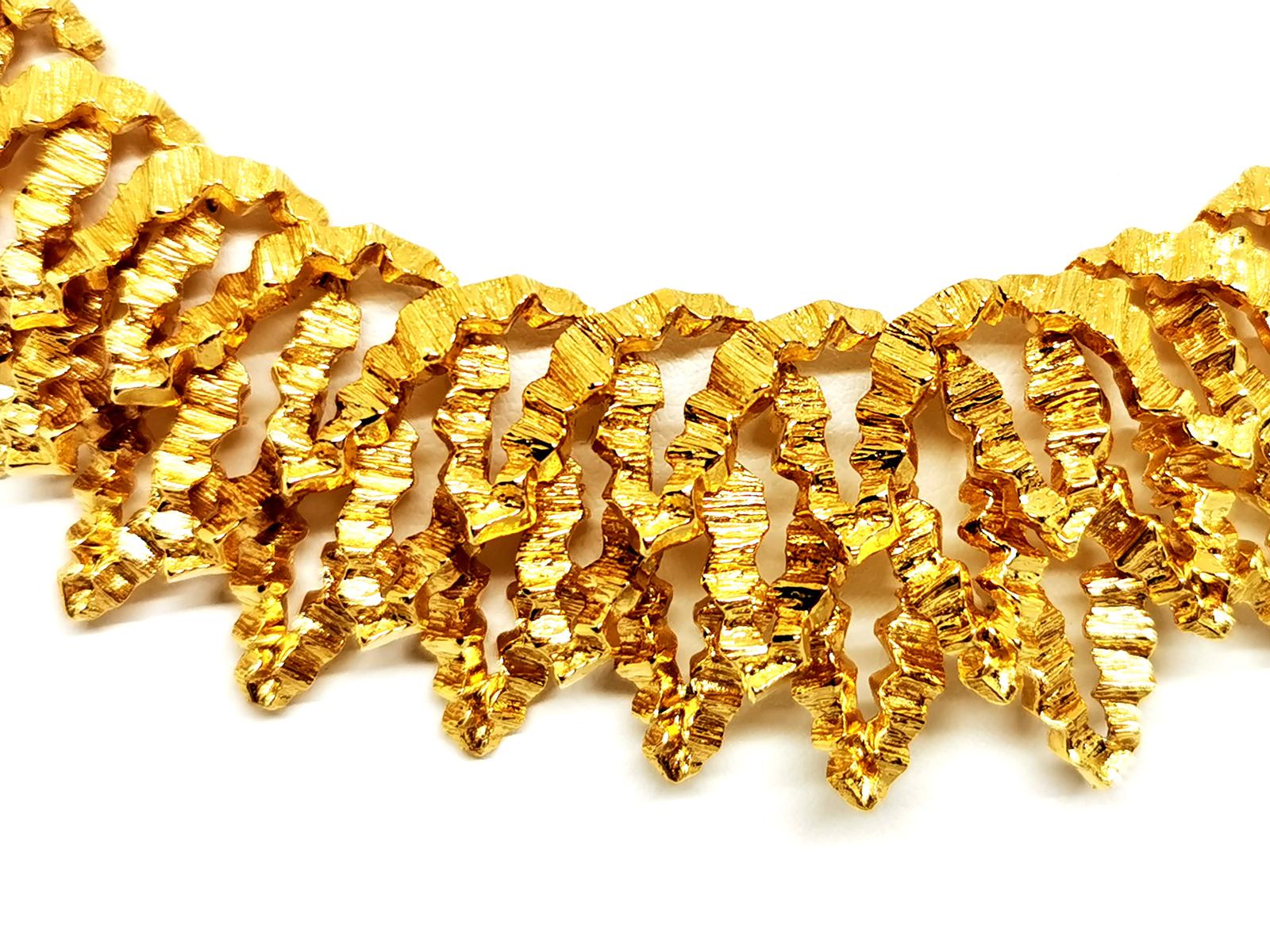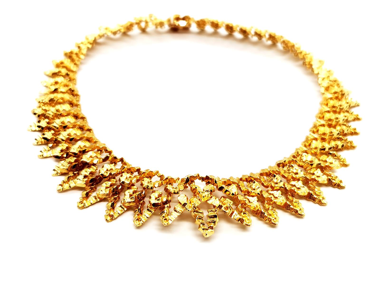 Collier vintage. signé de la maison Chaumet. en or jaune 750 millièmes (18 carats). modèle ras de cou. semi-rigide. en chute. composé d'une superposition de motifs en pointes. texture gaufré. longueur: 38 cm. largueur: de 1.89 cm à 2.86 cm. poids total: 148.67 g. signé Chaumet Paris. poinçon de maître. poinçon tête d'aigle. poinçon rhinocéros. fermoir languette avec clip de sécurité. excellent état.