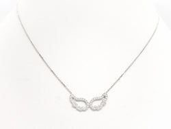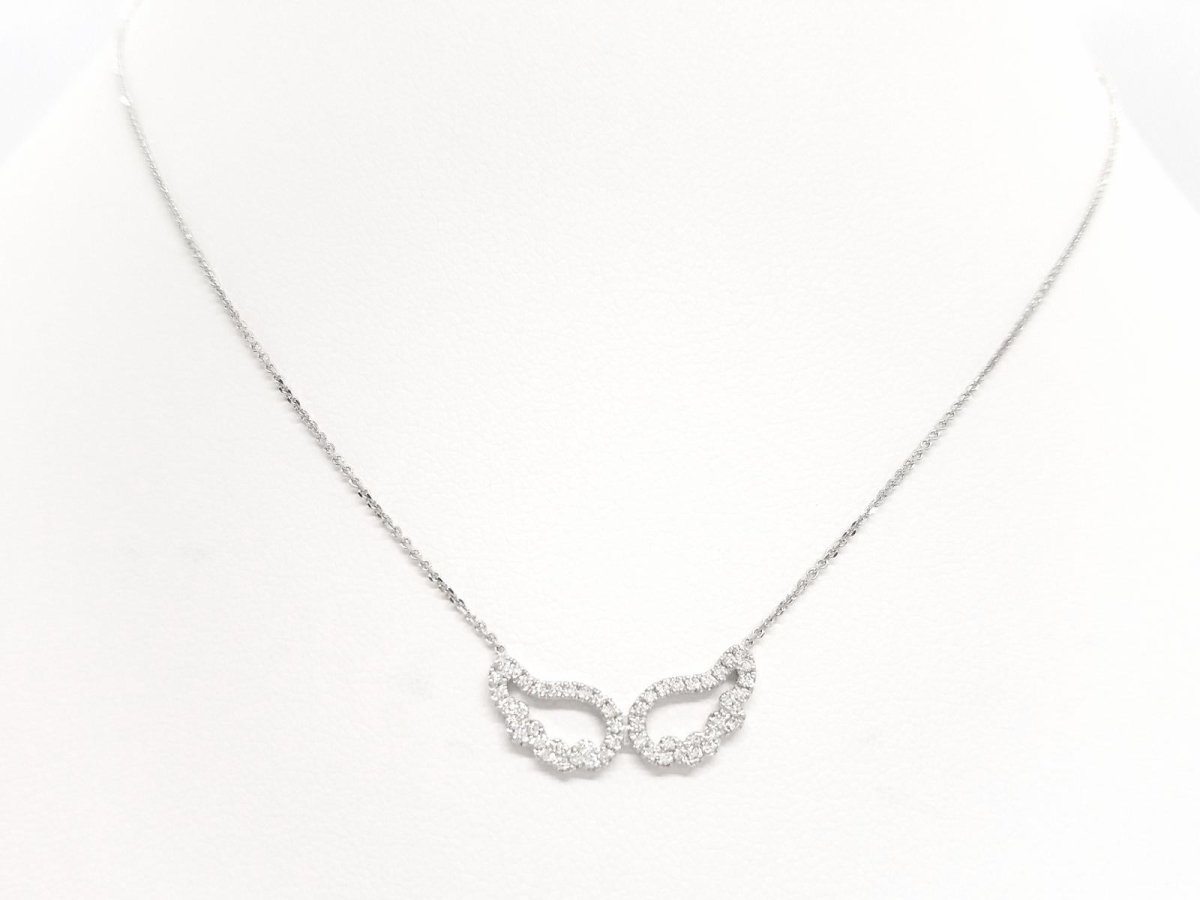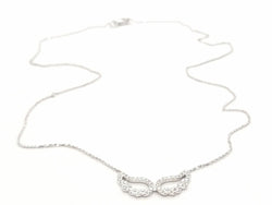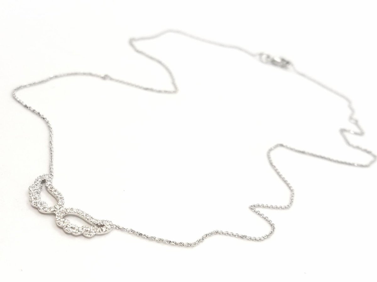 Collier en or blanc 750 millièmes (18 carats). pendentif ailes d'ange. pavé de diamants taille brillant pour un total de 0.23 ct. chaîne maille forçat de 0.7 mm de largeur. longueur chaîne: 42 cm avec anneau intermédiaire à 38 cm. dimensions du motif: 2 cm x 0.65 cm. poids total: 2.49 g. poinçon tête d'aigle. état neuf