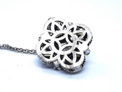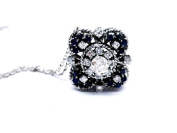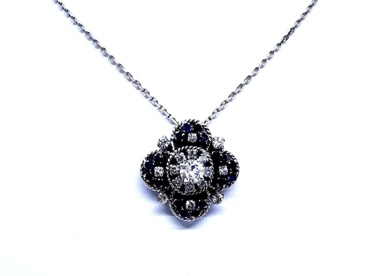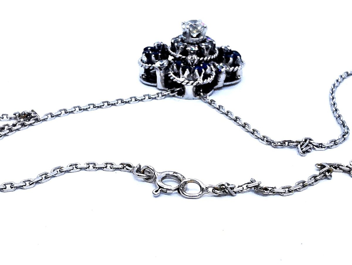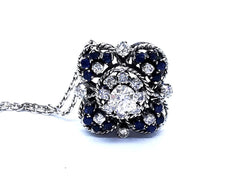 Magnifique collier vintage. en or blanc 750 millièmes (18 carats). pendentif serti d'un dialant central taille brillant G-H SI d'environ 0.70 ct. de 16 diamants taille brillant G-H SI pour environs 1.16 carats au total. et de 16 saphirs rond. poids total diamants: environ 1.86 carats. poids total saphirs: environ 1.36 carats. chaîne maille forçat. longueur chaîne: 45 cm. largeur chaîne: 0.16 cm. dimensions pendentif: 2.61 cm x 2.61 cm. poids total: 17.30 g. poinçon tête d'aigle. excellent état