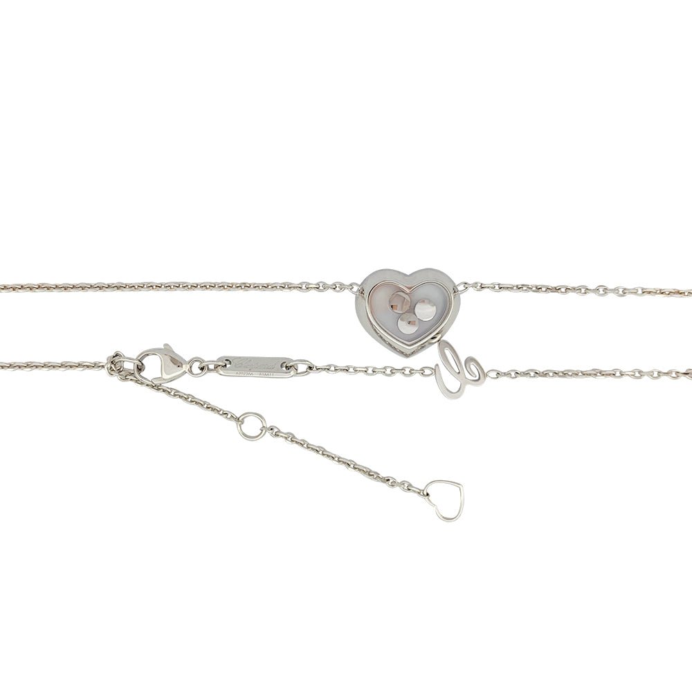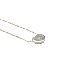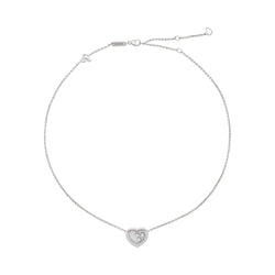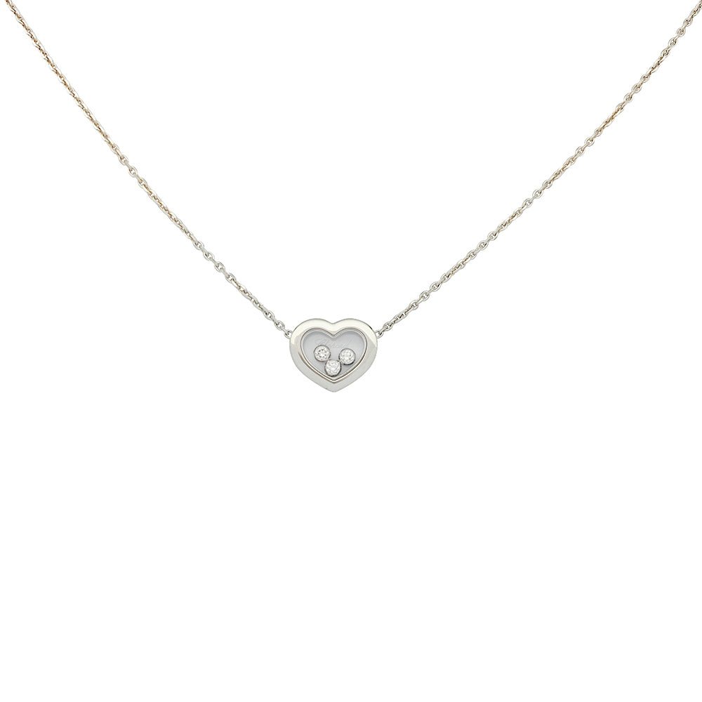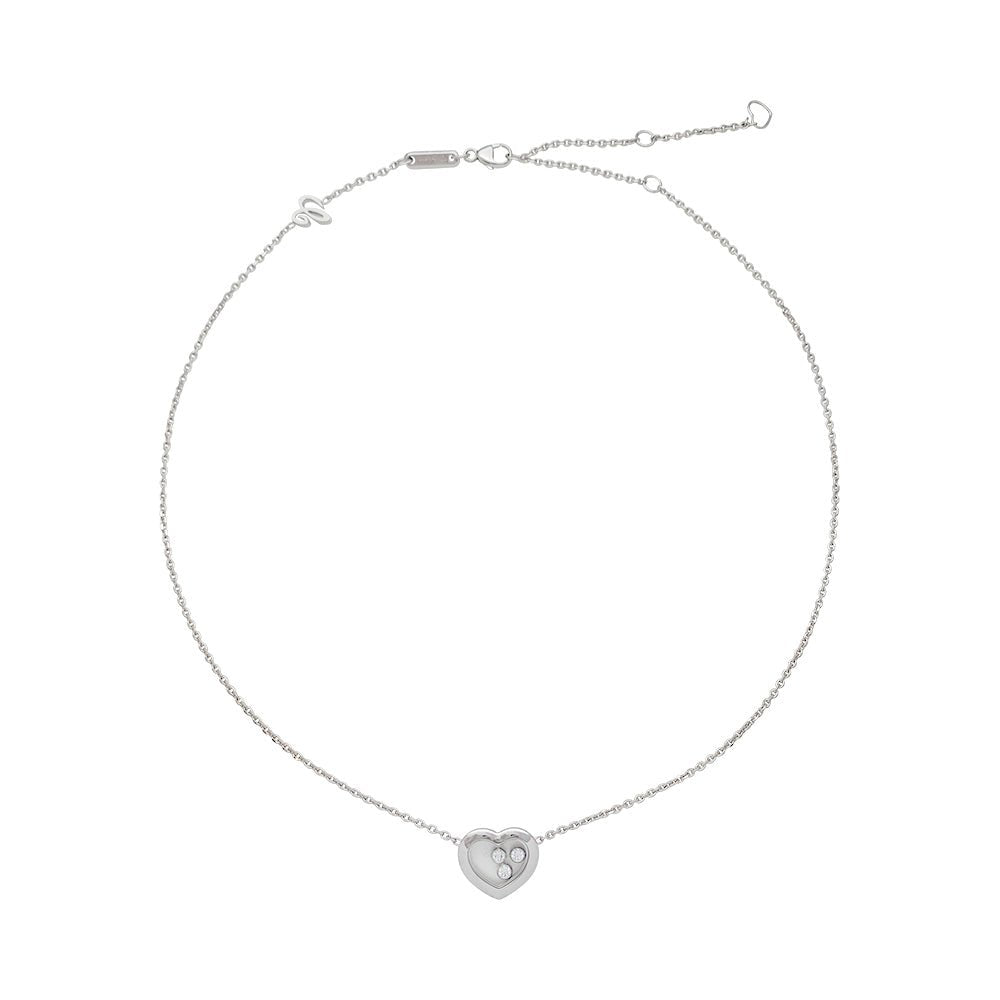 Un collier signé de la Maison Chopard, collection 'Happy Diamond', composé d'une chaîne maille forçat limée en or blanc 750/000 retenant un pendentif en or blanc 750/000 en forme de coeur abritant trois diamants taille brillant mobiles. Longueur : 360-390-420-440 mm Largeur : 12 mm Hauteur : 4 mm Poids : 7,80 grammes Poids du diamant : environ o,5 carat Prix neuf : 3210