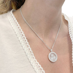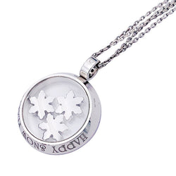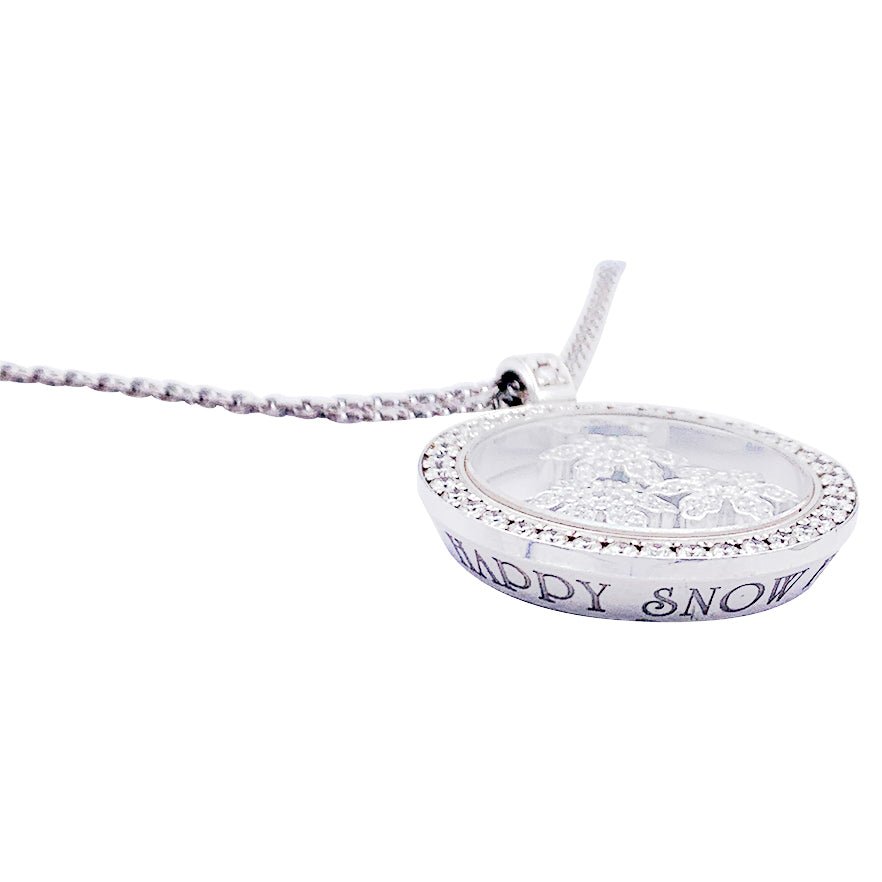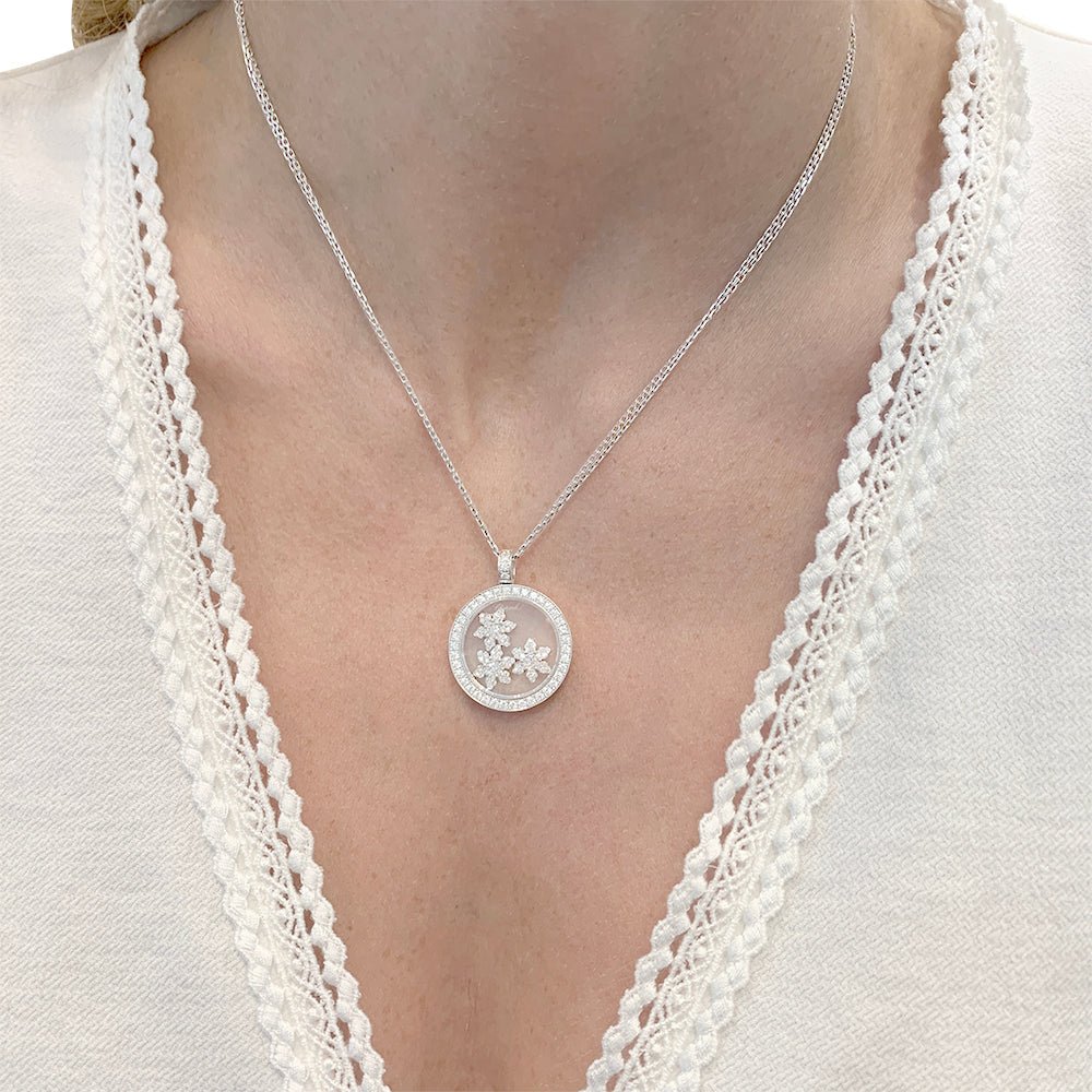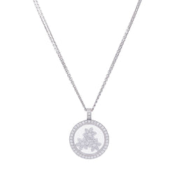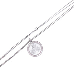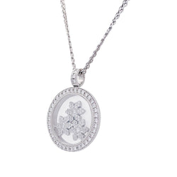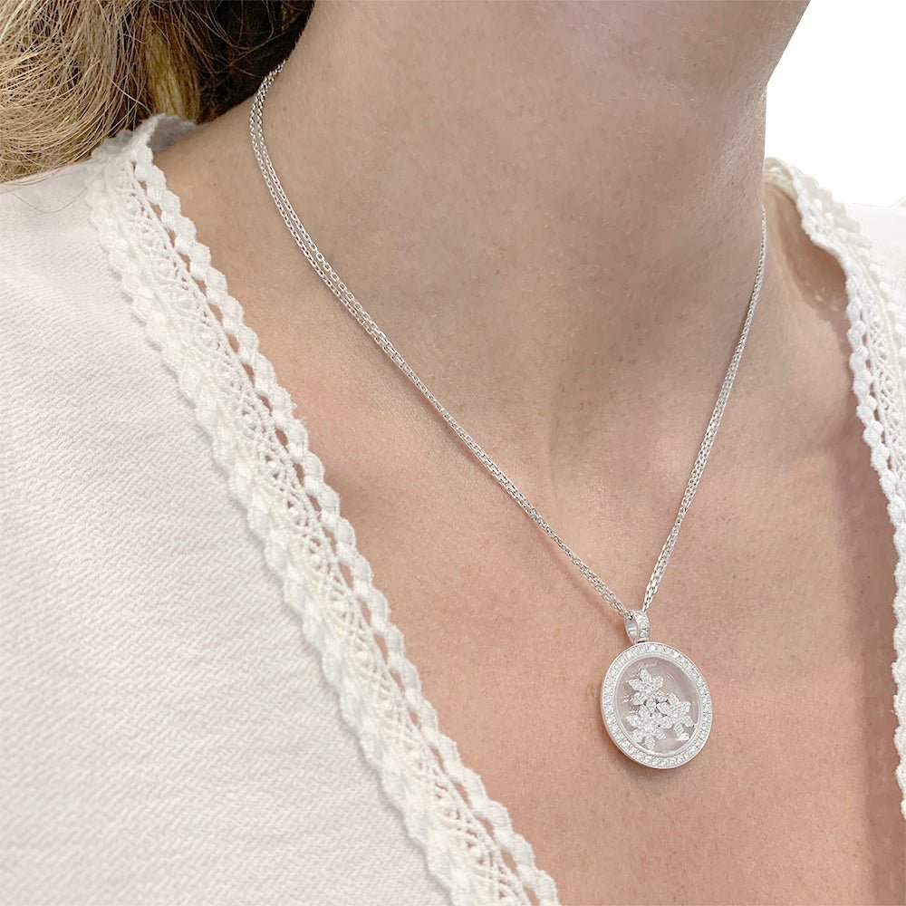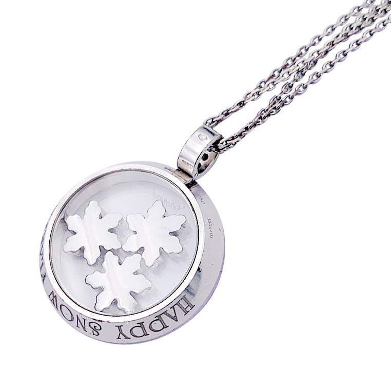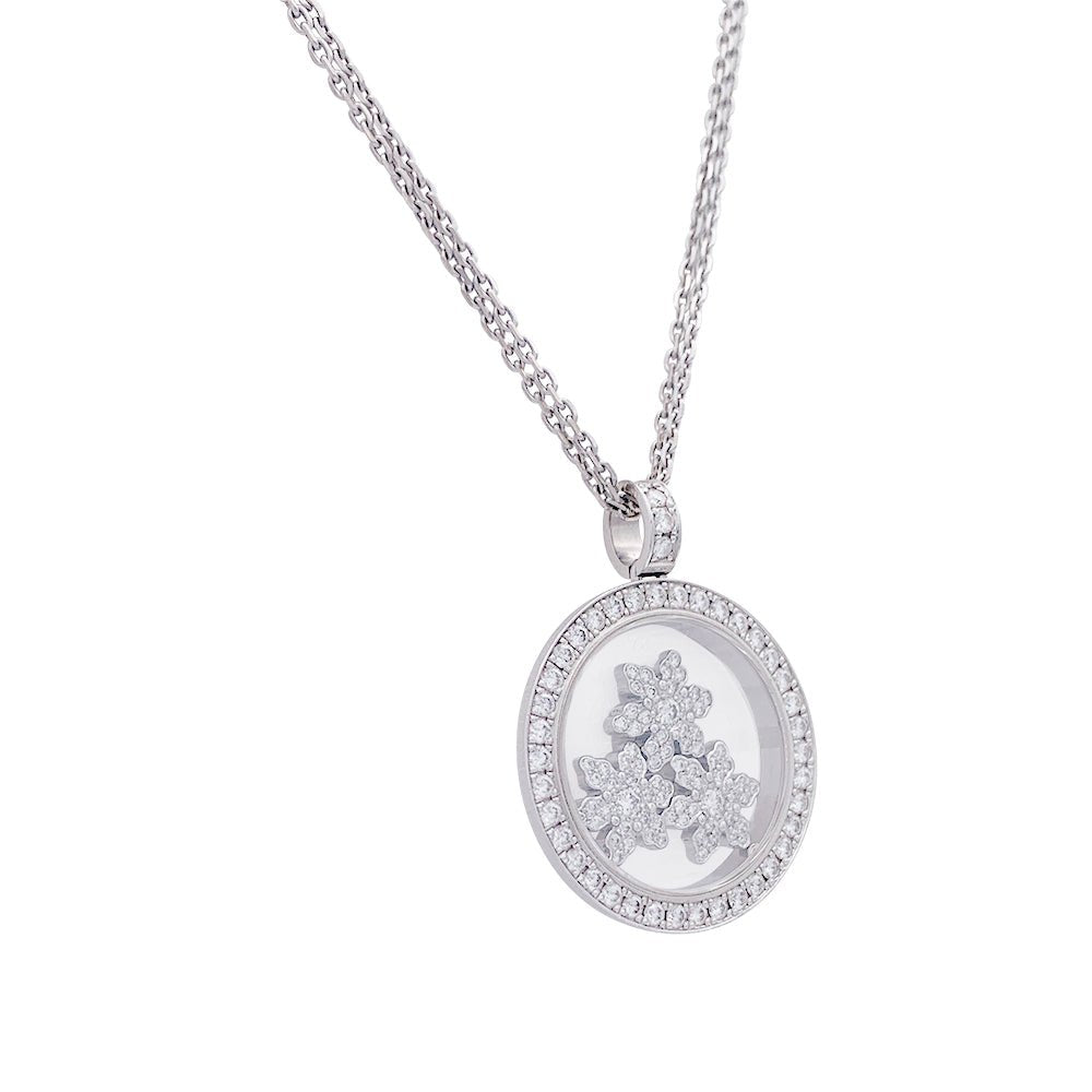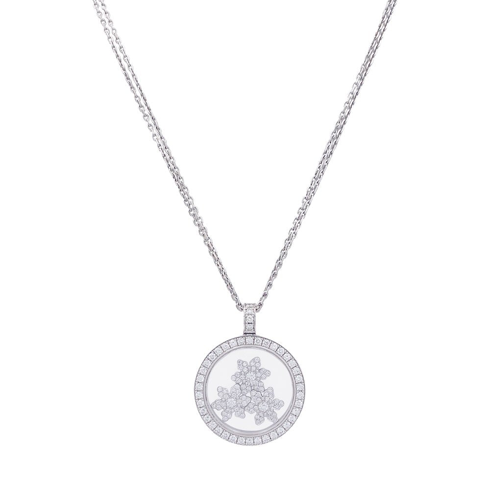 Un collier signé de la Maison Chopard, collection“Happy Snow Flakes”, en or blanc 750/000 composé d’une double chaîne maille forçat retenant un pendentif ajouré pavé diamants taille brillant et abritant sous glasses 3 motifs flocons serties de diamants Diamètre du pendentif : 23 mm. Longueur : 420 mm Poid : 19 grammes. Poid du diamand : 1,60 carat environ