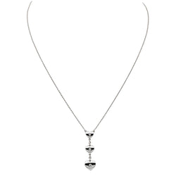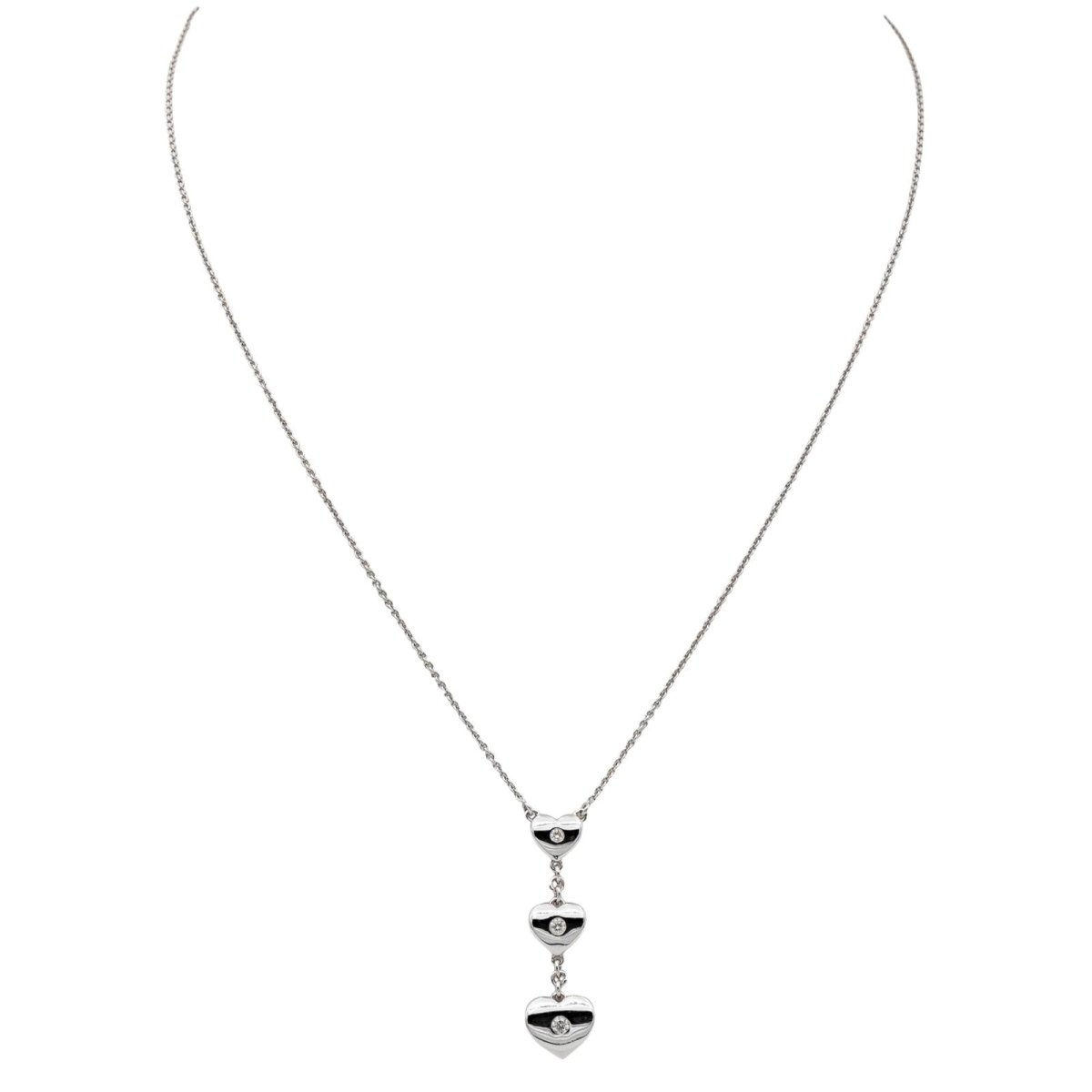 Collier en or blanc 750 millièmes (18 carats). motifs cœurs sertis de 3 diamants. taille brillant. poids total diamants : environ 0.12 ct. (chaque diamants d'un poids d'environ 0.04 ct. maille forçat. longueur : 45.00 cm. largeur de la chaîne : 0.07 cm. longueur de la partie comprenant les motifs : 3.23 cm. largeur : 0.95 cm. poids total : 4.74 g. poinçon hibou. excellent état