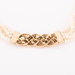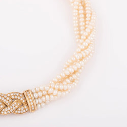 Collier en perles multirangs et fermoir en diamants Matière : Or jaune 18k Poinçon : Hibou Poids : 71,6 grs Longueur : 41,5 cm Largeur : 1,6 cm Diamètre : 3,3 mm Nombre de pierres: 99 pierres Total Carat: 2 cts Période: 1990