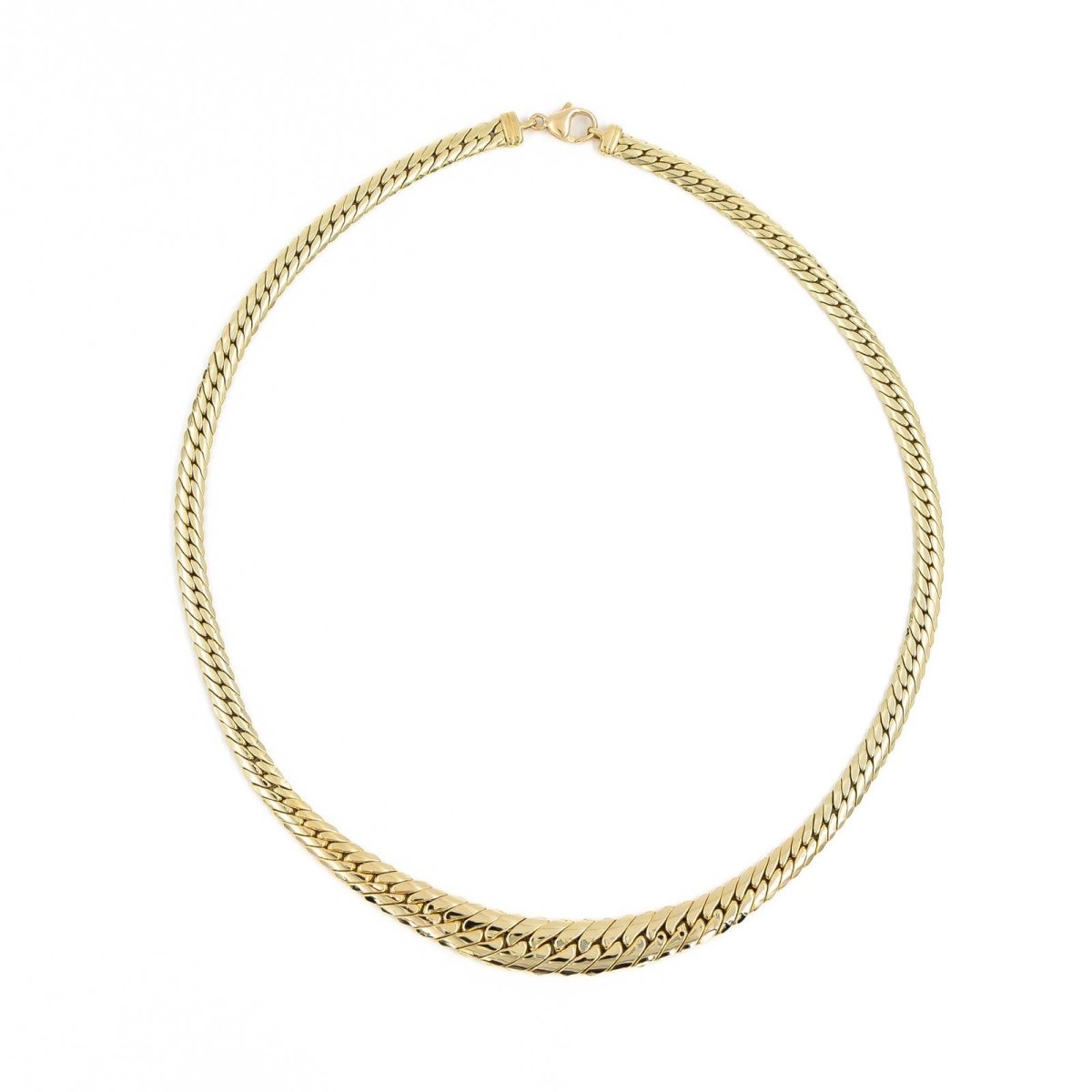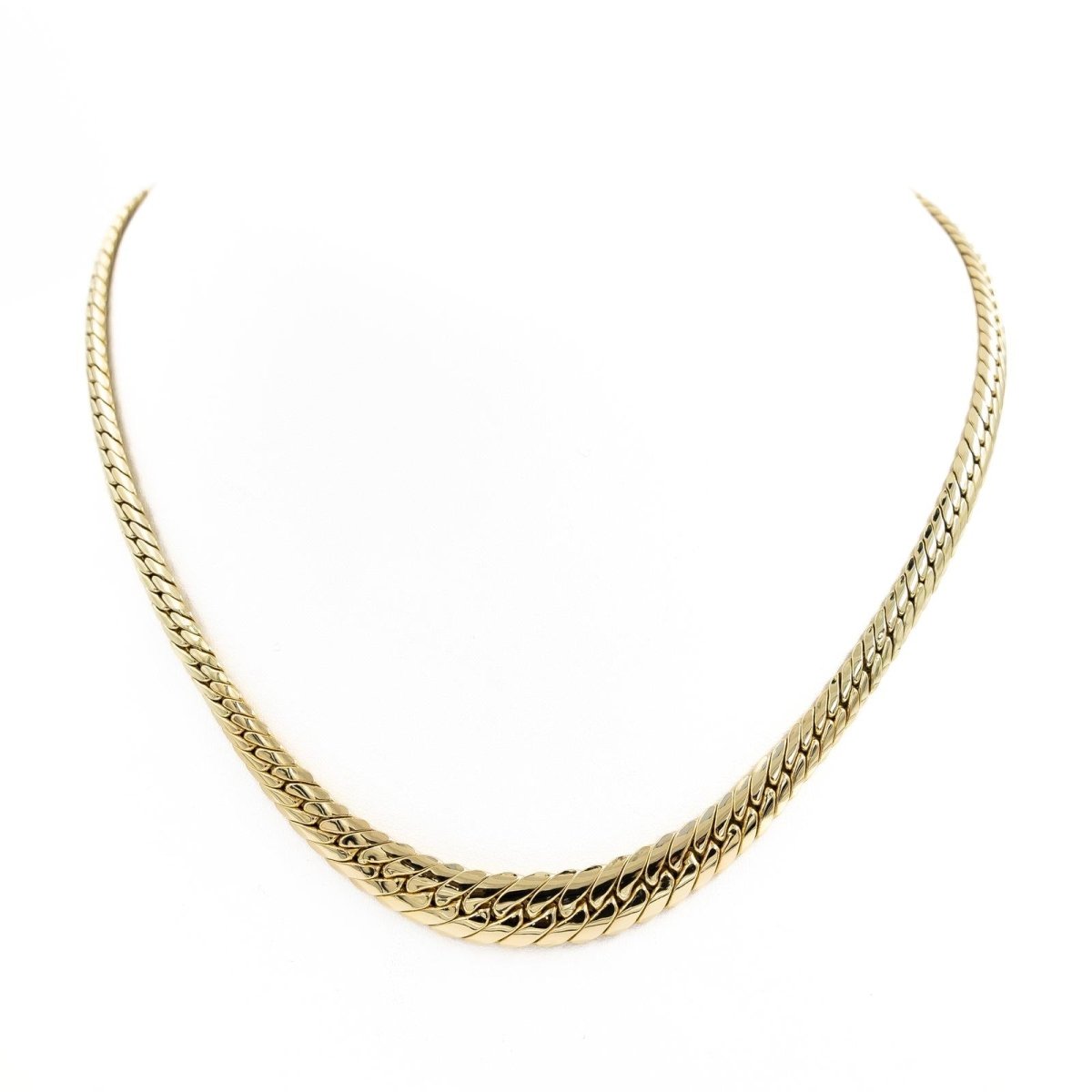 Collier en or jaune 750 millièmes (18 carats). maille anglaise en chute. Longueur: 45.5 cm. Largeur: 1 cm. Poids total: 22.59 g. Poinçon tête d'aigle. Excelllent état