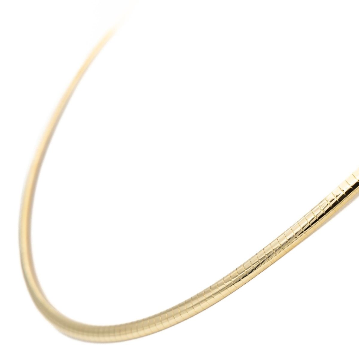 Collier en or jaune 18 carats à maille oméga semi-rigide. Fermoir avec huit de sécurité. Poids total : 21.57 g Longueur du bracelet : 44 cm Largueur : 0.39 cm Poinçon: tête d'aigle