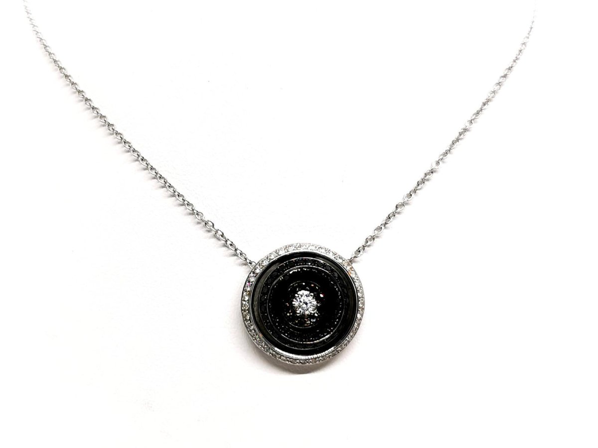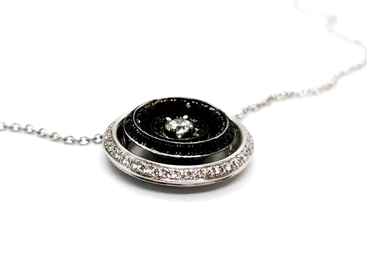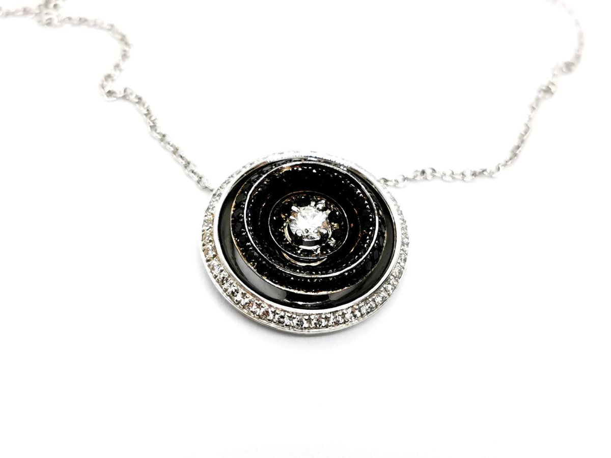 Collier en or blanc 750 millièmes (18 carats). pendentif rond. serti au centre d'un diamant blanc. taille brillant d'environ 0.18 ct. entouré de 62 diamants noir pour un total d'environ 0.37 ct. et de 37 diamants blanc pour un total d'environ 0.22 ct. poids total diamants: environ 0.77 ct. longueur: 43 cm avec anneau intermédiaire à 41cm. largeur chaîne: 0.14 cm. diamètre pendentif: 2 cm. poids total: 9.98 g. poinçonné. excellent état