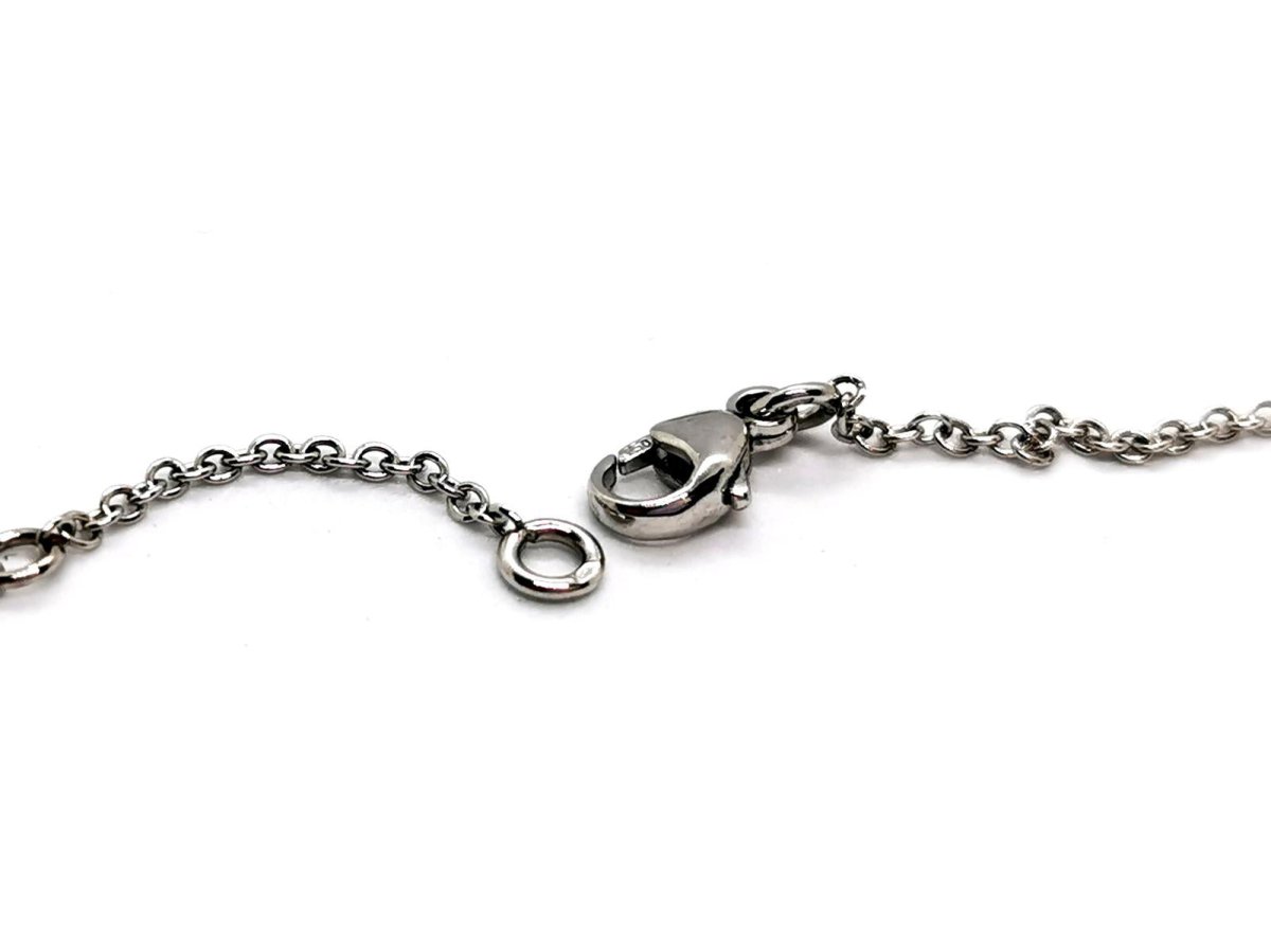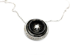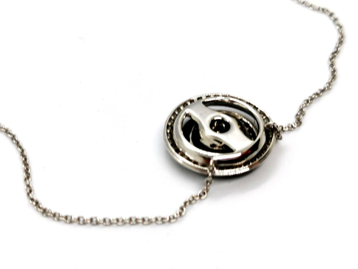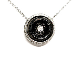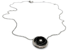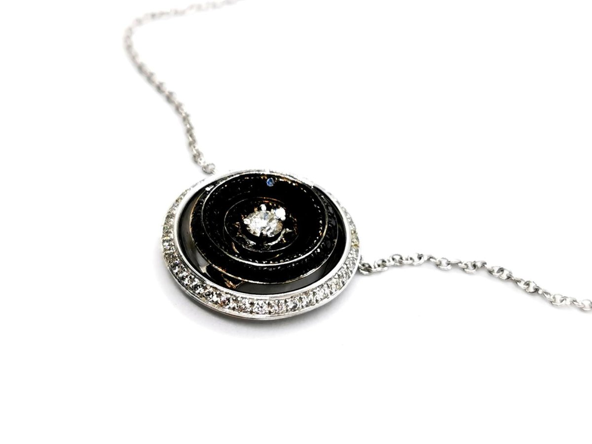 Collier en or blanc 750 millièmes (18 carats). pendentif rond. serti au centre d'un diamant blanc. taille brillant d'environ 0.18 ct. entouré de 62 diamants noir pour un total d'environ 0.37 ct. et de 37 diamants blanc pour un total d'environ 0.22 ct. poids total diamants: environ 0.77 ct. longueur: 43 cm avec anneau intermédiaire à 41cm. largeur chaîne: 0.14 cm. diamètre pendentif: 2 cm. poids total: 9.98 g. poinçonné. excellent état