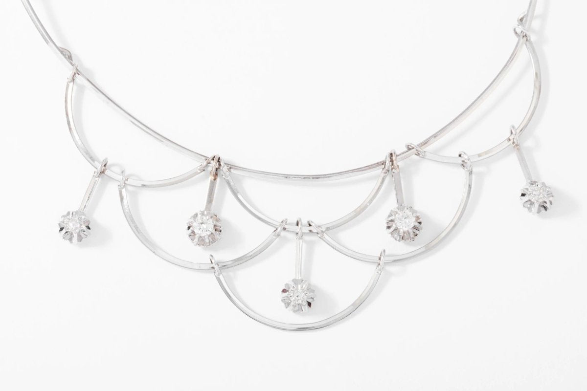 Collier en or gris et diamant datant des années 1960, joliment orné de demi lune en or, chaque cercle est orné de diamant. Matière : Or gris Poinçon : tête d'aigle Poids : 10,4grs Longueur : 40 cm Période : 1960