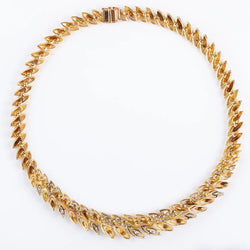Collier or jaune,platine et diamants des années 1960 formant des feuilles alternées de diamants,les feuilles en or sont ciselés. Matière : Or jaune 18k,platine Poinçon : Tête d'aigle et tête de chien Poids : 103,72 grs Longueur : 42grs Largeur : 1 à 1,5cm Nombre carat: 1,40 cts Nombre de pierres: 48 Période: 1960