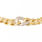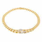 Collier en or jaune 750 millièmes (18 carats) en chute. maille gourmette épaisse. dimensions d'un petit maillon : 1.27 x 0.98 cm. épaisseur de la maille : 0.27 cm. dimension du maillon central : 2.42 x 1.90 cm. 38 diamants d'environ 0.02 ct chacun. poids total diamants : 0.72 ct. longueur du collier : 40 cm. poids total : 50.69 g. poinçon hibou. excellent état