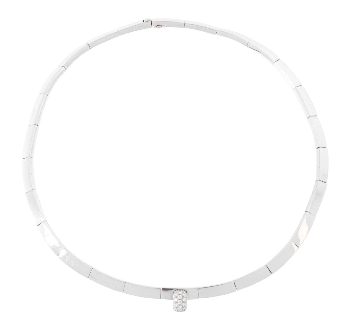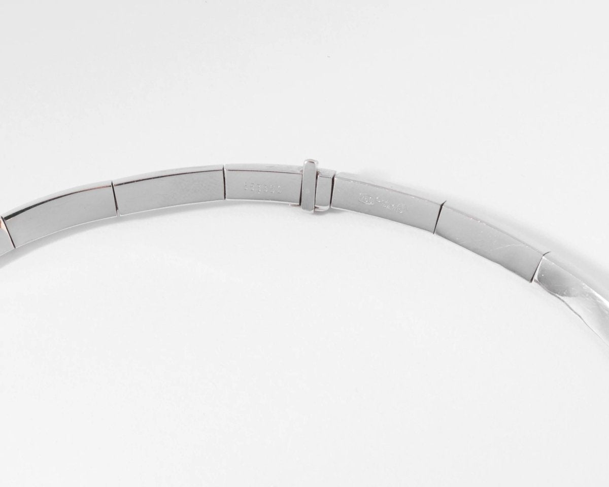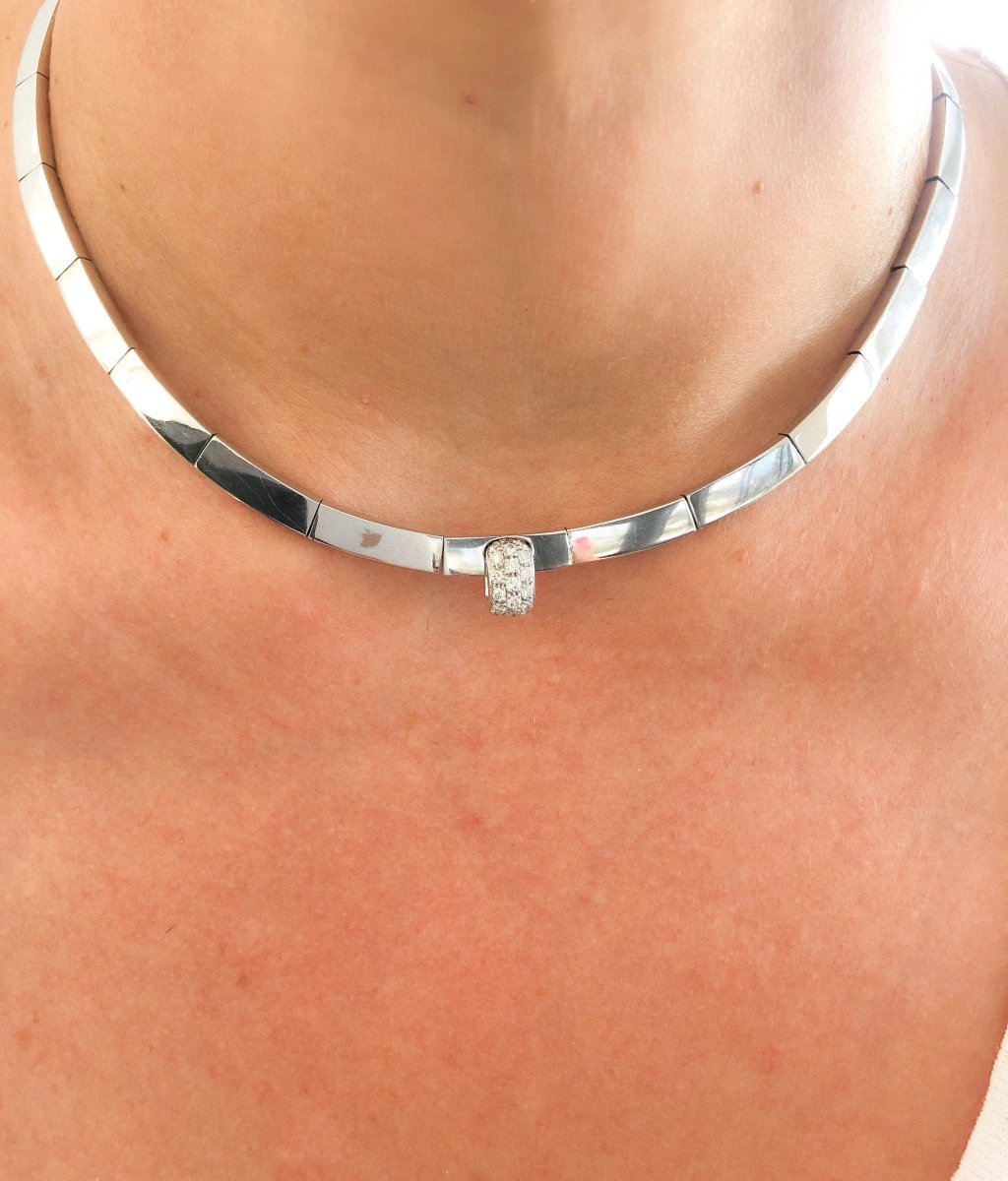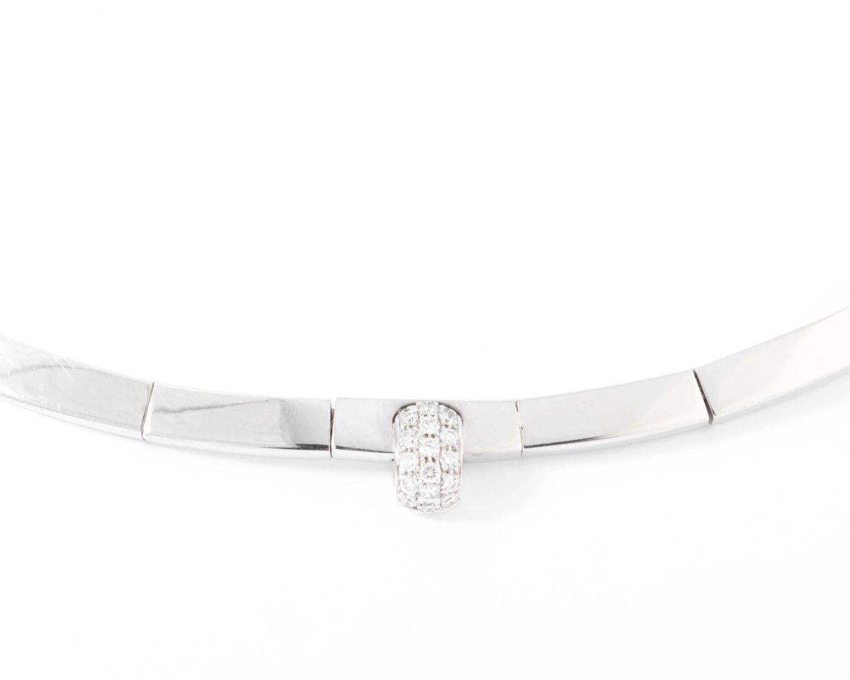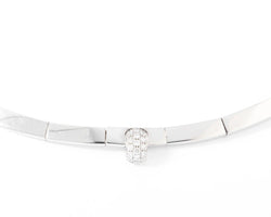Collier rigide signé de la maison Chaumet orné d'un motif pavé de diamant. Matière : Or gris Poinçon : Tête d'aigle Poids : 55grs Diamètre :12 Nombre de pierres: 19 Total Carat: 0,55 ct Période :2000