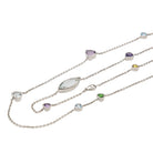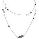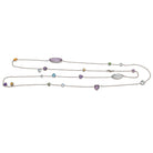 Magnifique Sautoir. Or blanc 18 carats. poinçonné. Poids total: 25 g. serti de Pierres fines multiples: améthyste ovale (20 mm x 8 mm). Aigue Marine losange (20 mm x 8 mm). saphir orangé. saphir vert. tsavorite ovale. saphir jaune.Peut se mettre sous plusieurs formes. cour ou long. un ou deux tours. Taille: 95 cm. Etat neuf. Prix neuf: 12 000 €