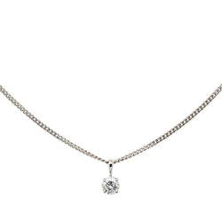 Collier solitaire en or blanc 750 millièmes (18 carats). serti d'un diamant. taille brillant. d'un poids d'environ 0.75 ct. maille gourmette. longueur : 45.50 cm. longueur de la partie comprenant les motifs : 1.09 cm. largeur : 0.58 cm. poids total : 5.83 g. poinçon tête d’aigle. excellent état