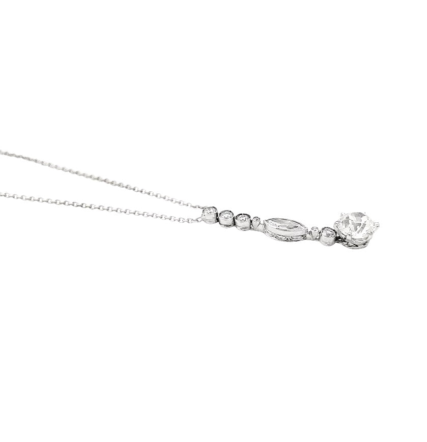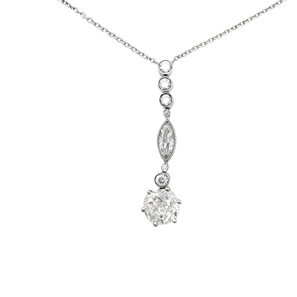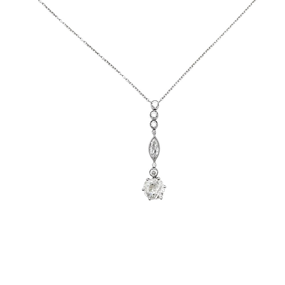Un collier en or blanc 750/000 retenant un pendentif constitué d’une ligne de diamants taille navette et ancienne retenant un diamant taille ancienne de 1,20 carat, chaton en platine 950/000. Qualité estimée: I, SI. Longueur : 400 mm Poids : 3,9 grammes Poids du diamant : environ 1,70 carat au total