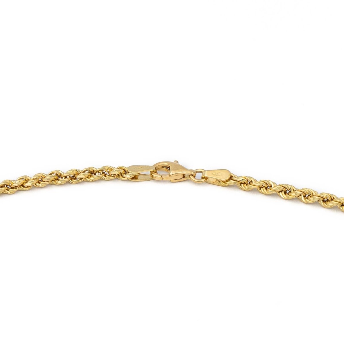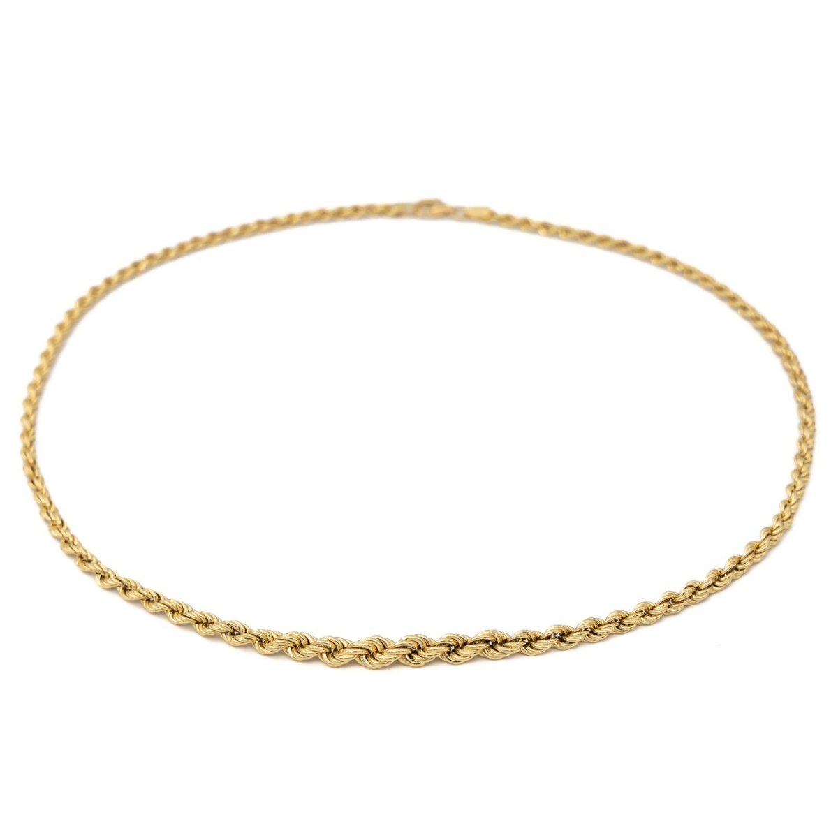 Chaine en or jaune 750 millièmes (18 carats). maille torsadée en chute. longueur: 42.5 cm. largeur sur le devant: 0.53 cm. largeur dans le dos: 0.26 cm. poids total: 7.57 g. poinçon tête d’aigle. excellent état