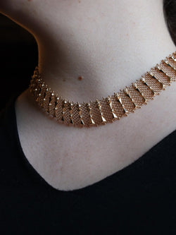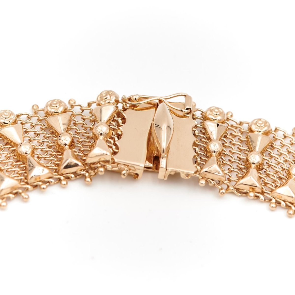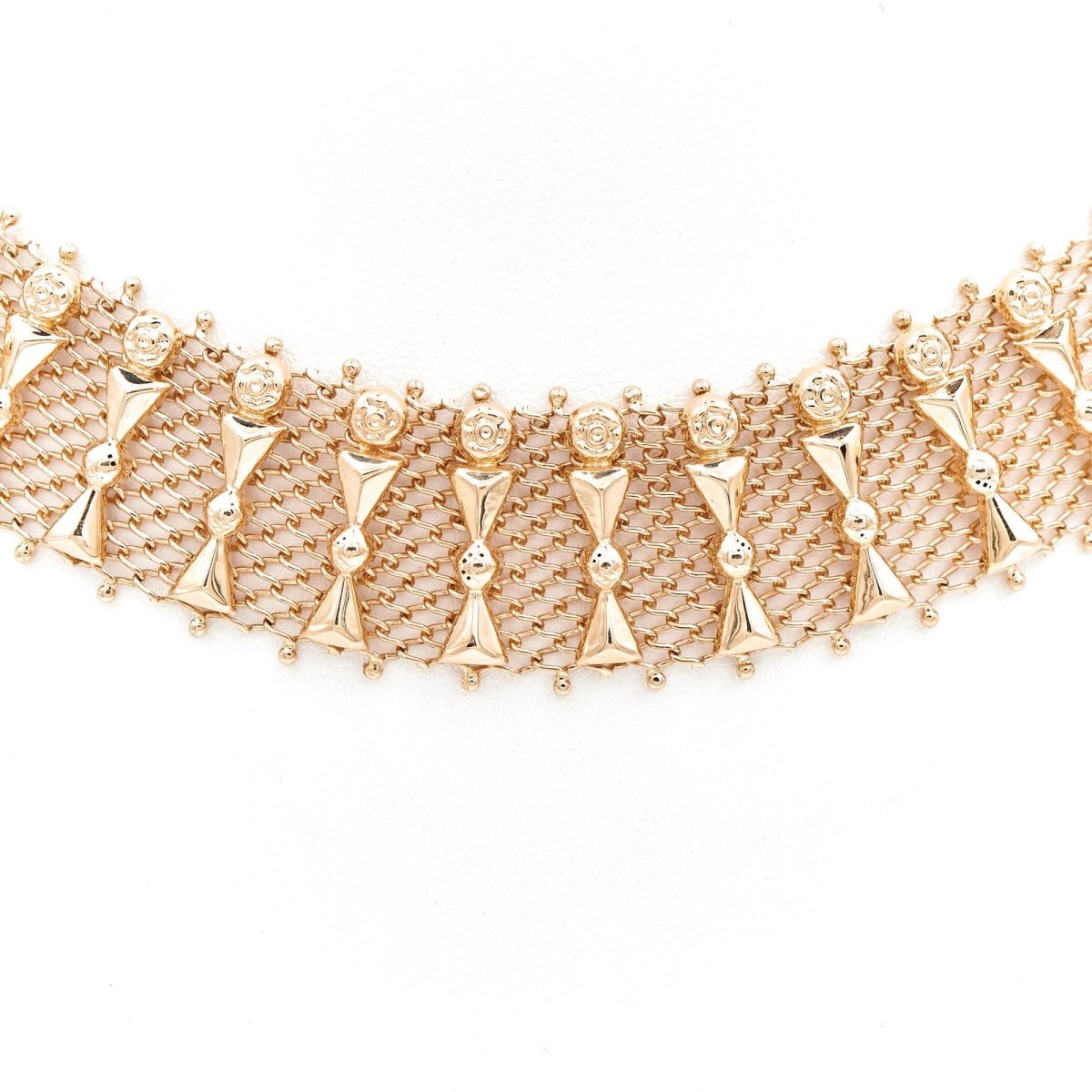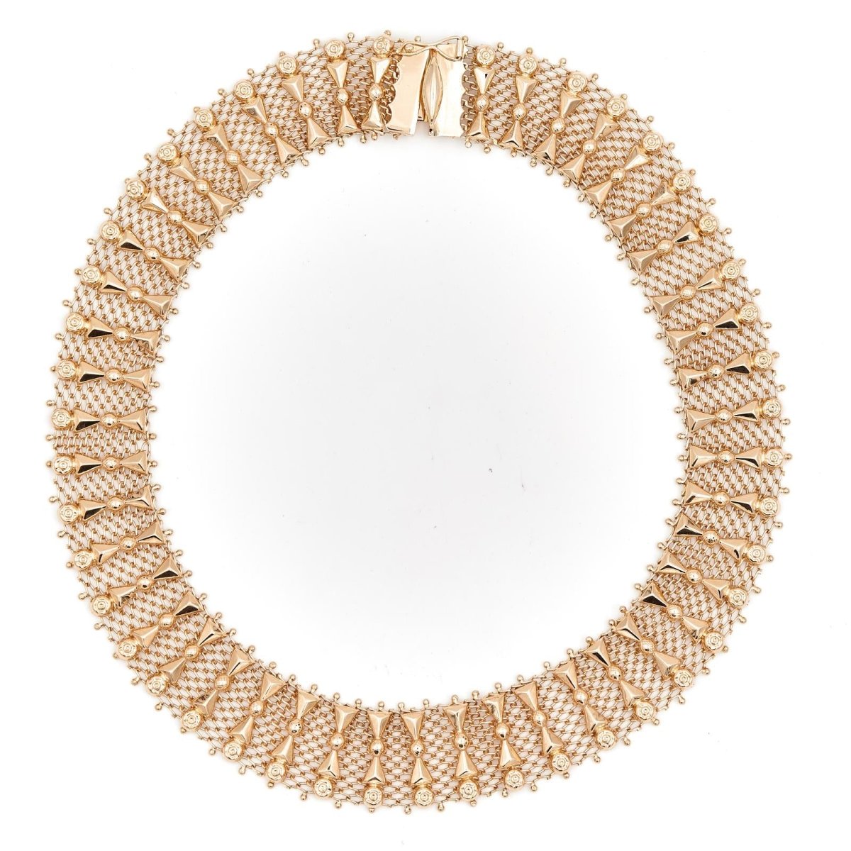 Collier en or jaune 750 millièmes (18 carats). maille fine décorée de roses à l'une des extrémités sur la longueur. fermoir avec un huit de sécurité. poids total : 55.10 g. longueur 41.5 cm. largeur 1.7 cm. poinçon hibou. excellent état