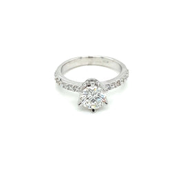 Bague de fiançailles en or 18 carats comprenant un diamant rond de taille brillant de couleur G et de pureté VS2, pesant 1 ct. HRD Antwerp et orné de 14 diamants ronds de taille brillant plus petits, d'un poids total de 0,60 ctLe diamant porte le numéro de certificat inscrit au laser sur la gaineÀ l'intérieur de l'anneau est estampillé le poids du diamant et vous pouvez le personnaliser avec votre phrase.La taille de la bague 10 peut être redimensionnée sur demande.Cette bague est issue de notre propre production. Elle peut être commandée sur demande, en choisissant la qualité, le poids et la taille du diamant que vous préférez.