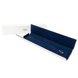 Bracelet signé de la Maison Fred. moyen modèle Force 10. manille en or blanc 750 millièmes (18 carats). dimensions de la manille: 2.45 x 0.90 cm. embouts du cable en acier. bracelet corderie bleue marine. longueur: 17.00 cm. poids total: 4.70 g. vendu avec l'écrin d'origine. excellent état