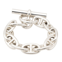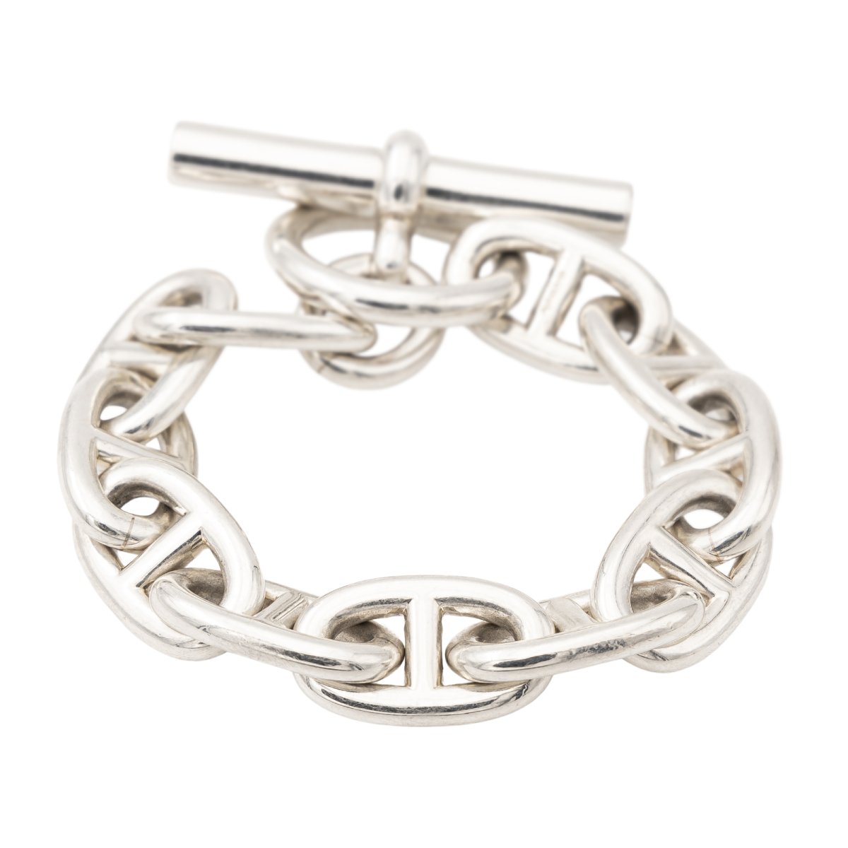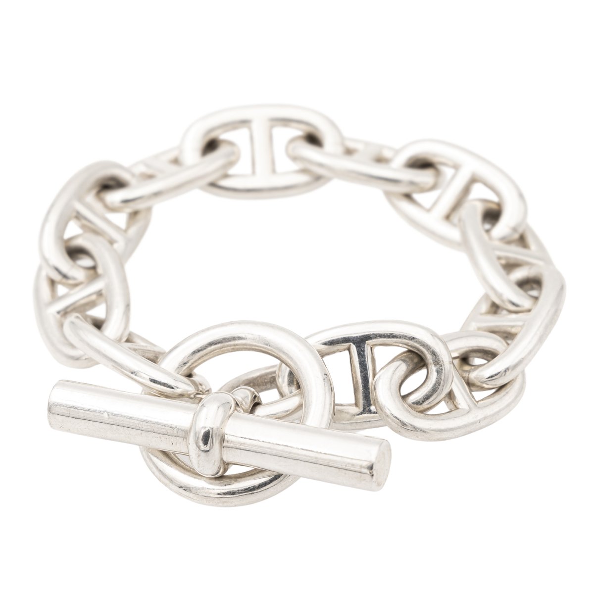 Bracelet signé de la Maison Hermès en argent 925 millièmes. Grand modèle Chaîne d'ancre. longueur: 22 cm. Largeur: 1.38 cm. Poids total: 98.87 g. boîte d'origine. Poinçon cygne. Excellent état