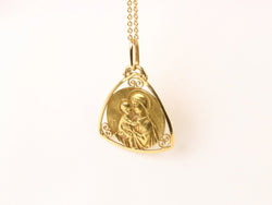 Médaille en or 18k (750°/°°) de forme triangulaire composée d’un médaillon représentant la vierge à l’enfant et décoré d’arabesques.Signée Mazzoni et présence d’une trace de poinçon de fabricantTravail français de style Art Nouveau Excellent état général, infimes rayures d’usage, la médaille pourra être repolie sur demandePoids brut : 3,9 grammesHauteur (sans bélière) : 2,5 cm