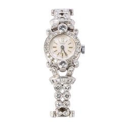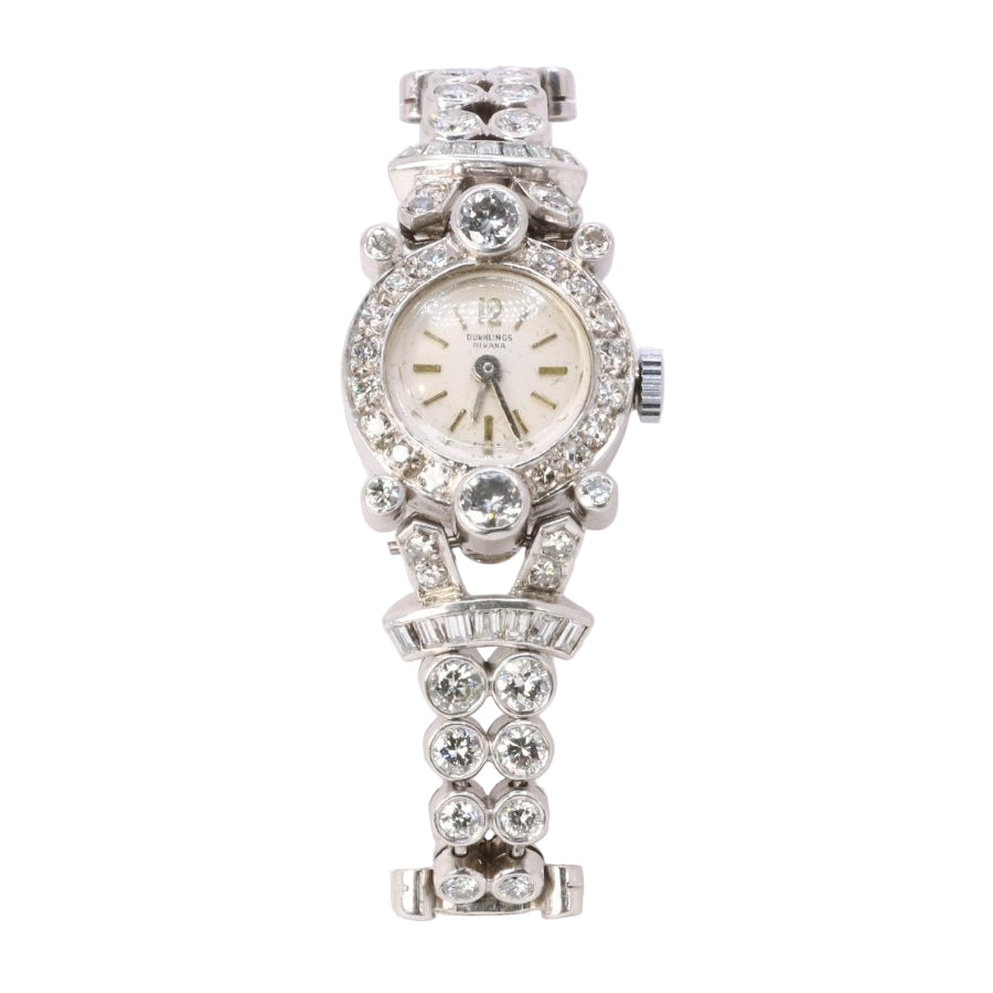 Montre Art déco en or blanc 18 carats et platine décorée d’un motif géométrique serti de diamants. Cadran signé DUNKLINGS RIVANA. Mouvement mécanique à remontage manuel. Circa 1925.