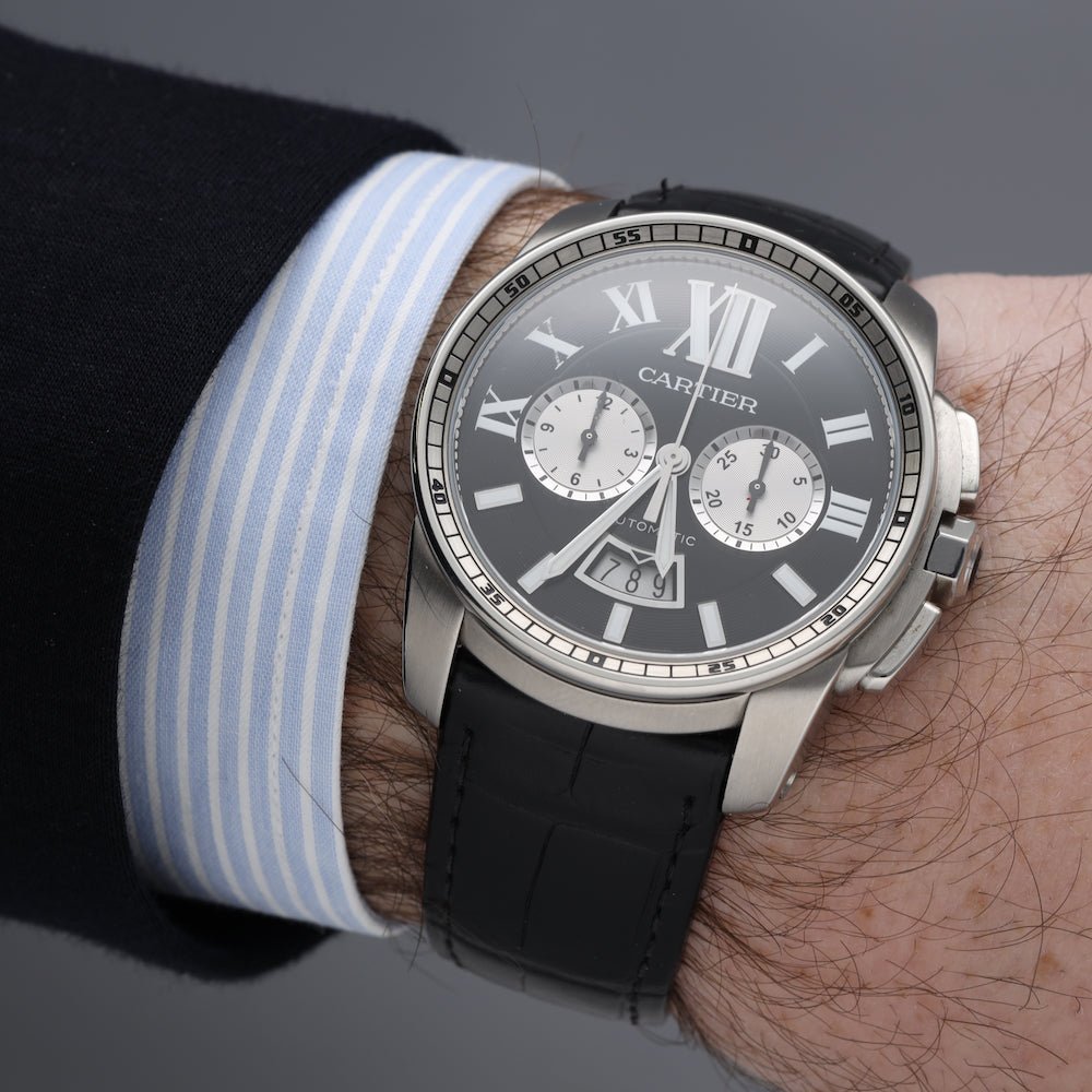 Cartier "Calibre Chronographe" en acier inoxydable, mouvement automatique, accompagnée de sa boîte et papiers d'origine