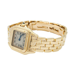 Une montre signée de la Maison Cartier modèle 'Panthère', en or jaune 750/000 sur bracelet or jaune 750/000 avec boucle déployante. Couronne ornée d'un saphir bleu, cadran crème, aiguilles en forme de glaive en acier bleui, verre saphir. Longueur : 30 mm Largeur : 22 mm Mouvement : Quartz