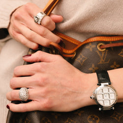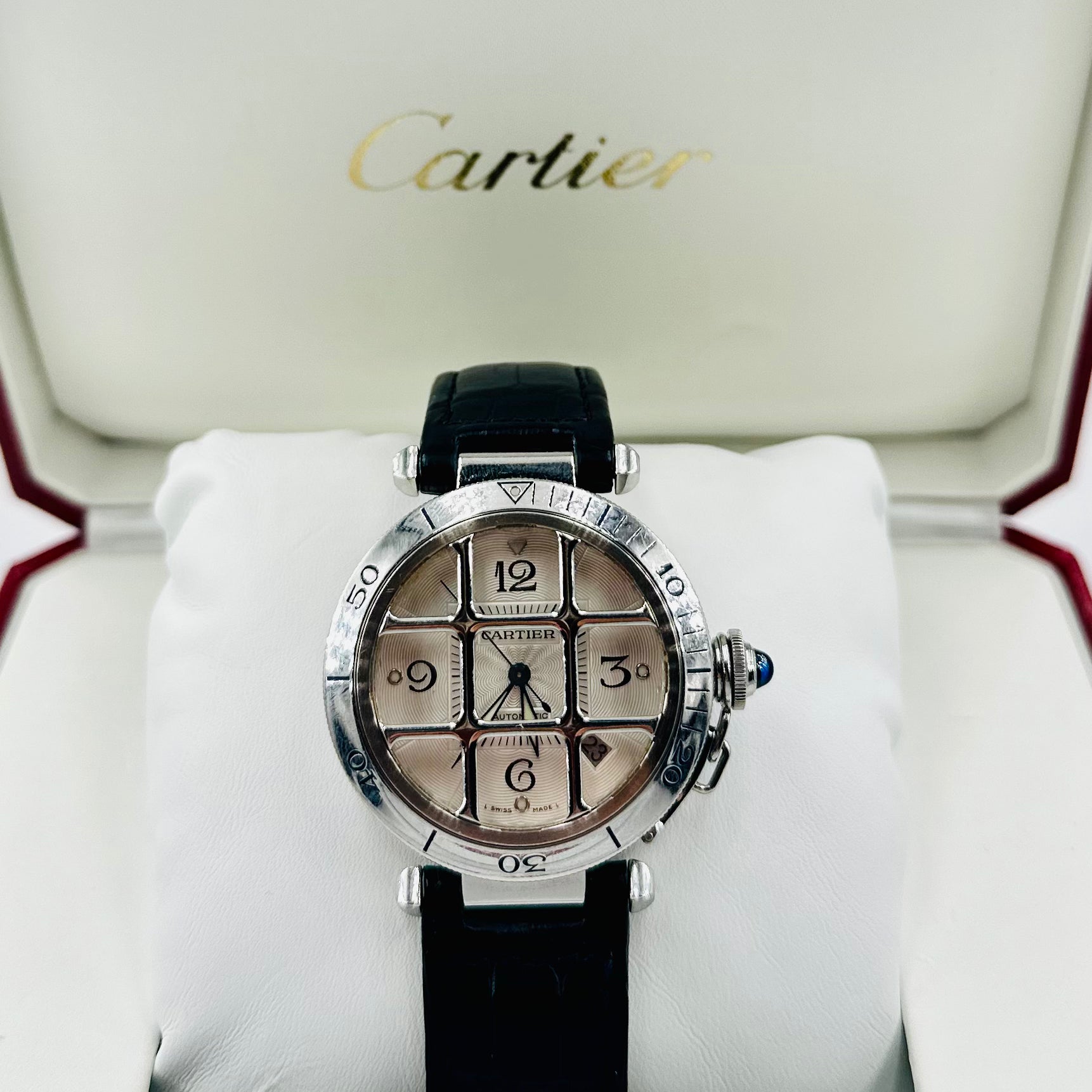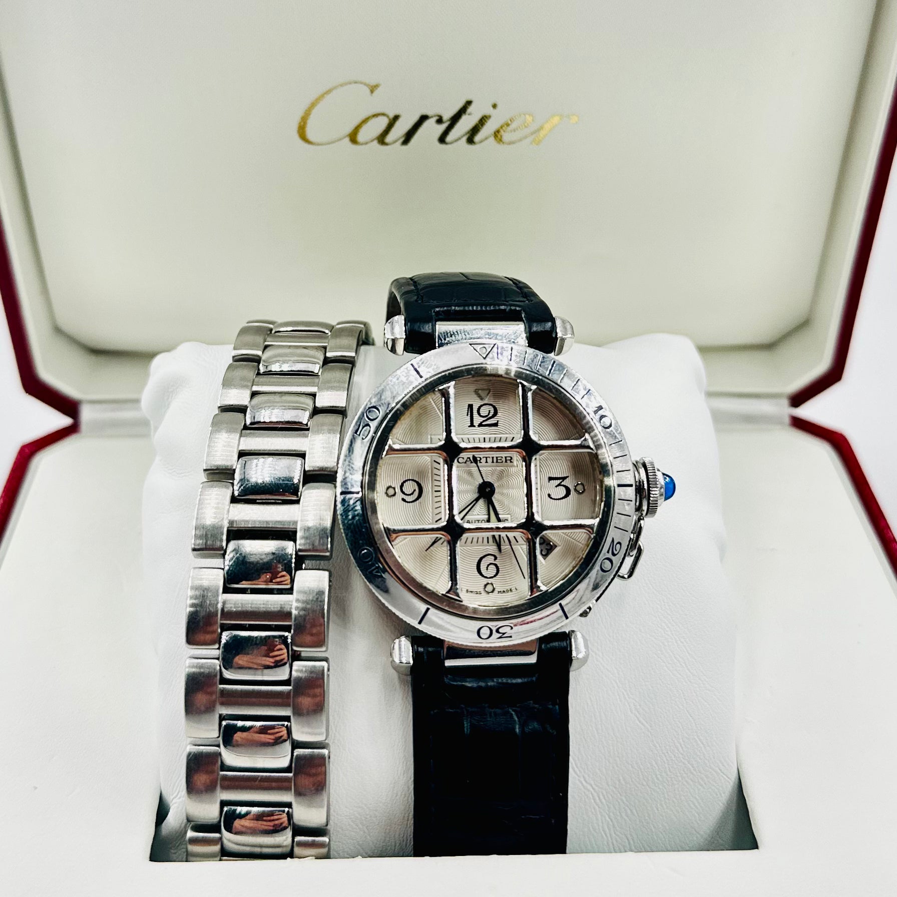 Montre CARTIER "Pasha" en acier, dotée de son emblématique grille de cadran amovible. La montre possède deux bracelets interchangeables : le premier en cuir, le second en acier.