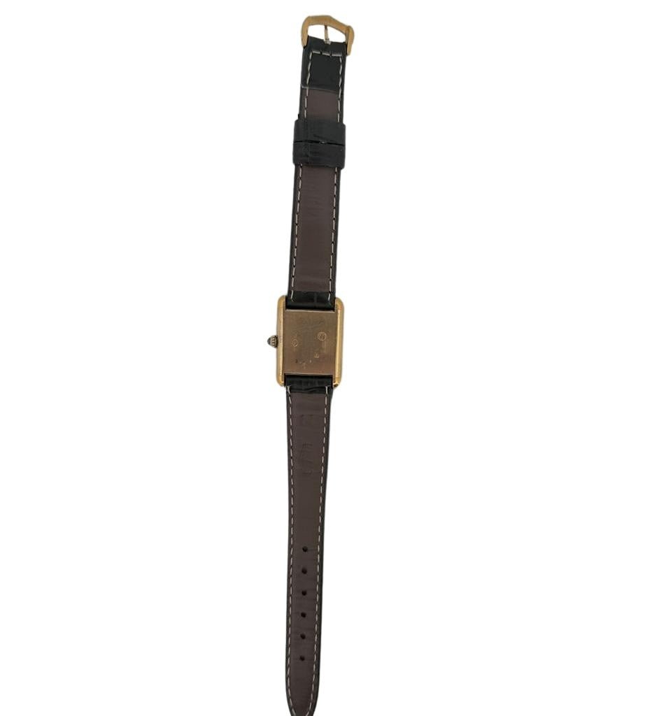 Montre CARTIER "Tank Must" en plaqué or. Cadran fond noir, boucle d'origine, bracelet en cuir noir rapporté.