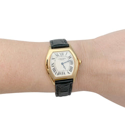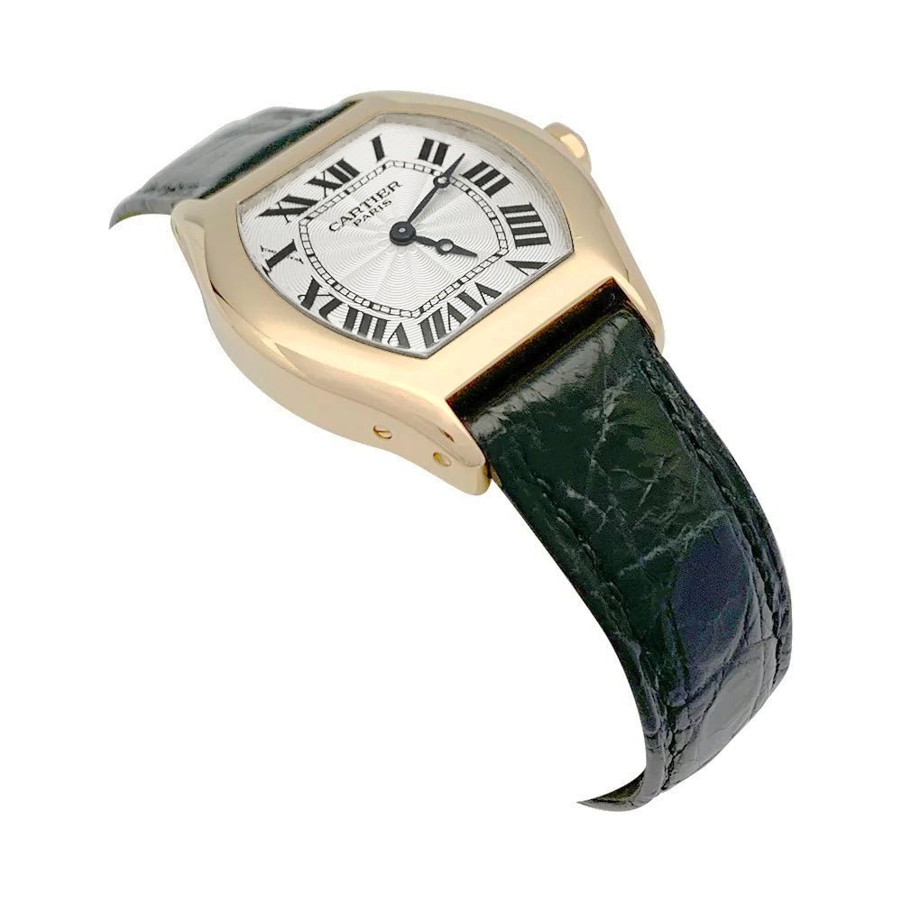 Une montre signée de la Maison Cartier, modèle 'Tortue', en or jaune 750/000 sur bracelet de cuir. Cadran guilloché argenté, chiffres romains, fond squelette. Boucle déployante en or rose 750/000. Longueur : 33 mm Largeur : 27 mm Mouvement : Mécanique