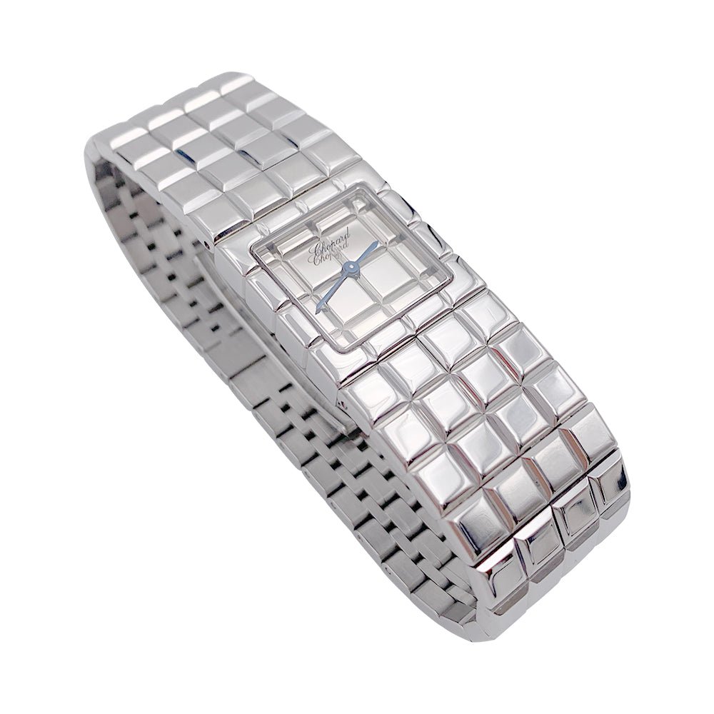 Une montre signée de la Maison Chopard, collection 'Ice Cube', en acier sur sur bracelet acier avec une boucle déployante. Cadran argenté. Largeur : 21 m Mouvement : Quartz