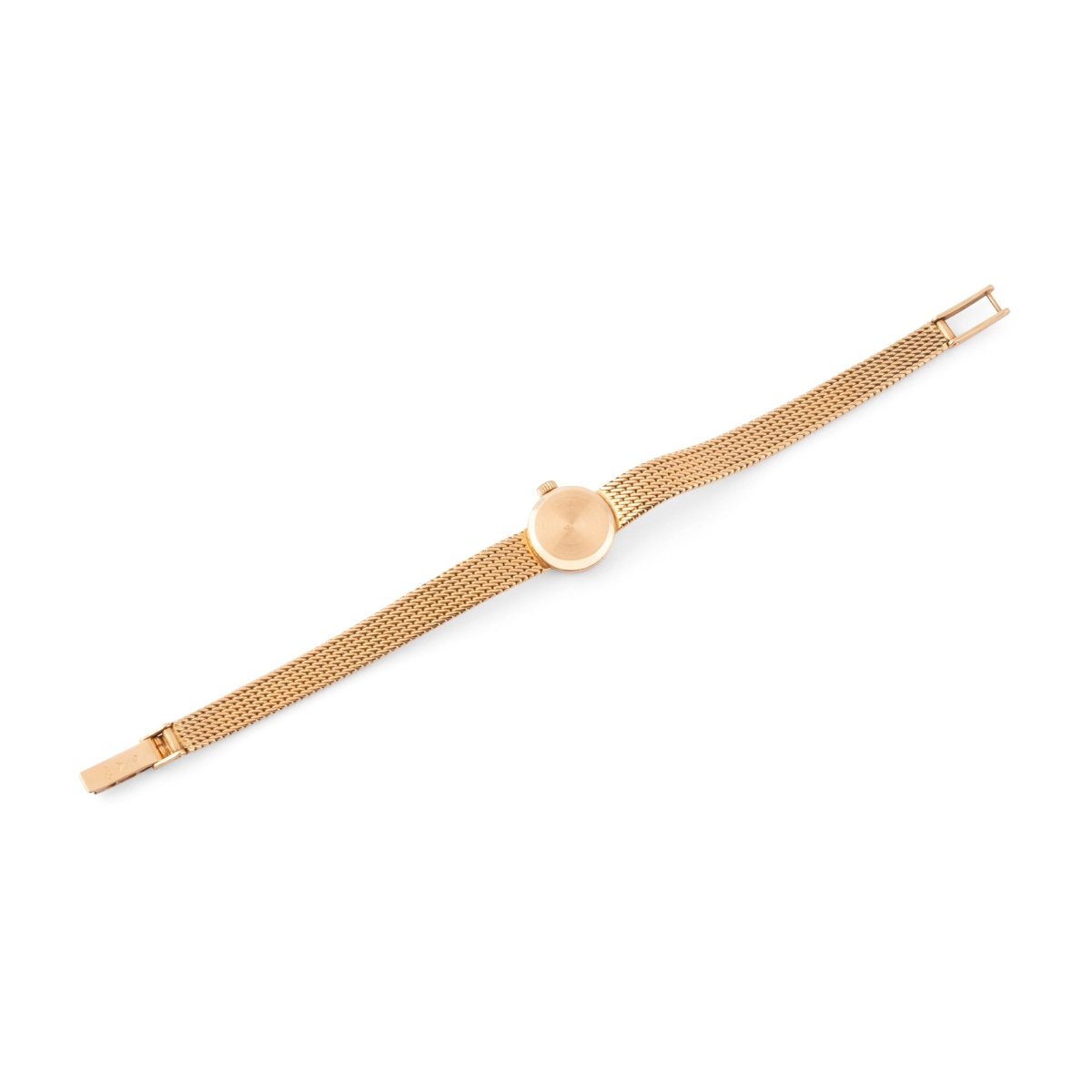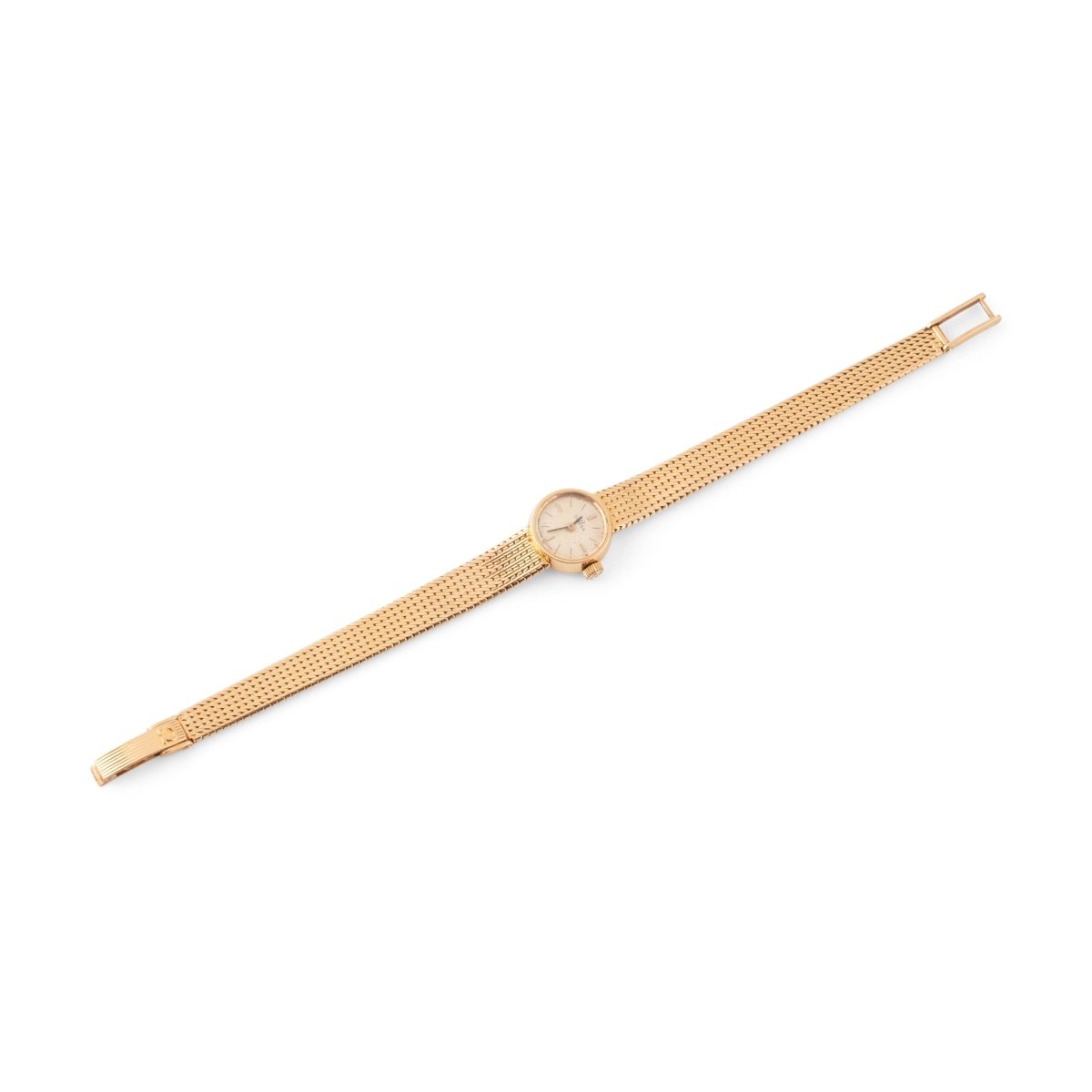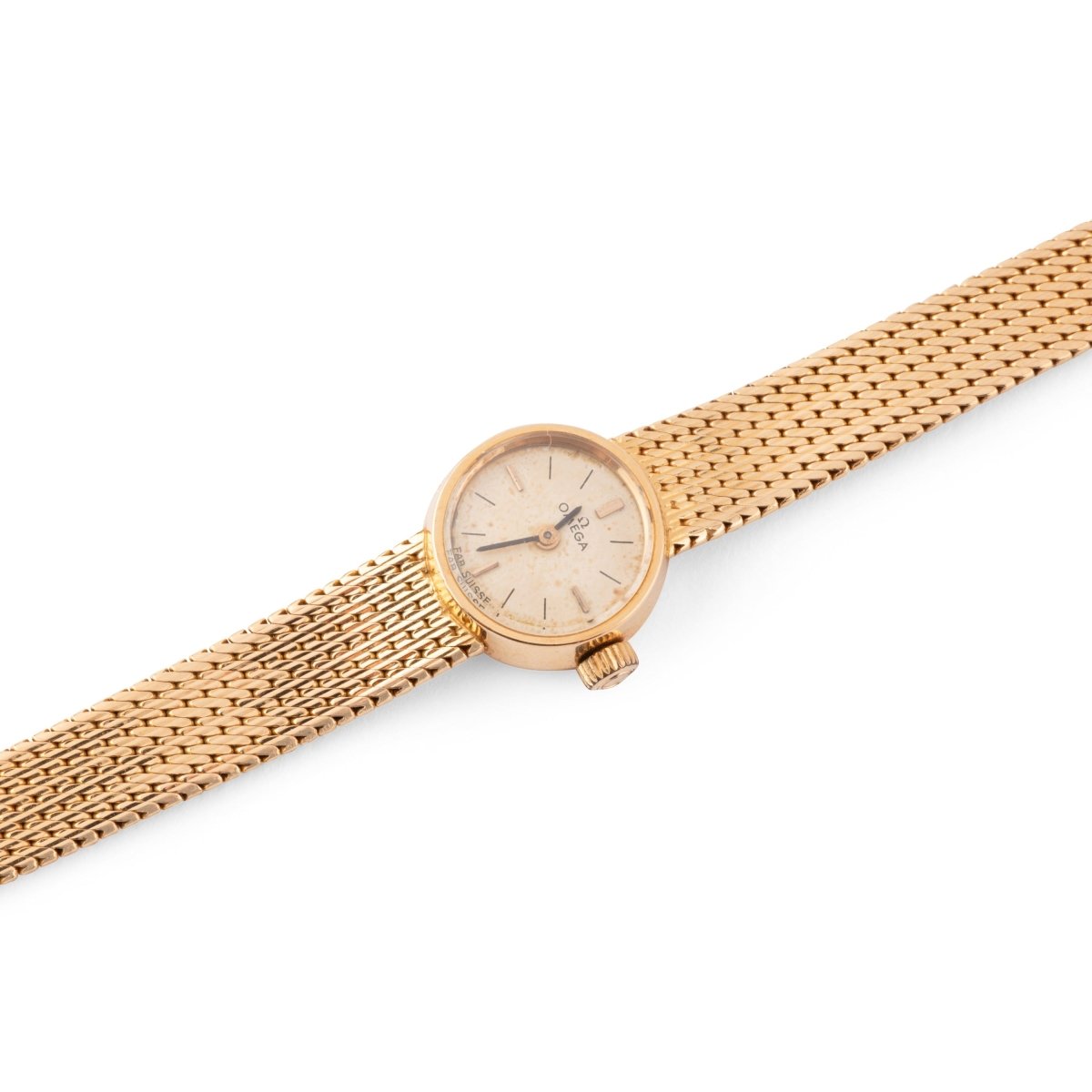 Montre de dame OMEGA en or jaune 18 carats. Le cadran rond, le bracelet souple à mailles fines torsadées. Mouvement quartz.