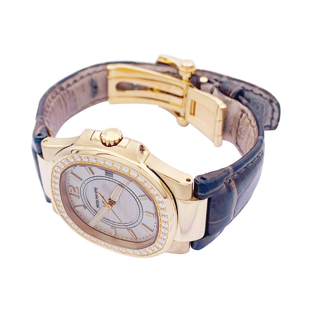 Une montre signée de la Maison Patek Philippe, modèle 'Nautilus', composée d'une lunette sertie de diamants taille brillant sur un boitier en or rose 750/ooo, d'un bracelet en cuir avec une boucle double déployante en or rose 750/ooo. Le cadran est doré, d'exterieur lisse avec un centre au relief horizontal frappé. Index appliqués avec un revêtement luminescent et une date à 3 heures . La collection Nautilus fut crée dans les années 1970 par le designer Gérald Genta, qui créa notamment la Royal Oak d’Audemars Piguet quelques années auparavant. Longueur : 40 mm Largeur : 35 mm Diamètre : 32 mm Poid du diamand : 46 diamants pour un total estimé de 0,73 carat. Mouvement : Mouvement quartz Boite d'origine : Oui