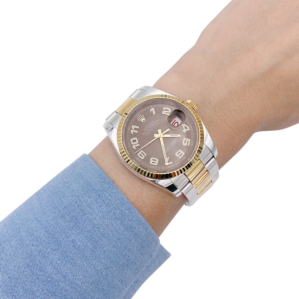 Une montre signée de la Maison Rolex, collection 'Oyster Perpetual Datejust', en acier et avec une couronne crantée en or 18 carats sur une bracelet Oyster en acier et en or 18 carats. Le cadran chocolat est lisse, les index en chiffres arabes sont placés sur une bande en surbrillance. La date est indiquée à 3 heures. Diamètre : 36 mm Mouvement : Mouvement automatique