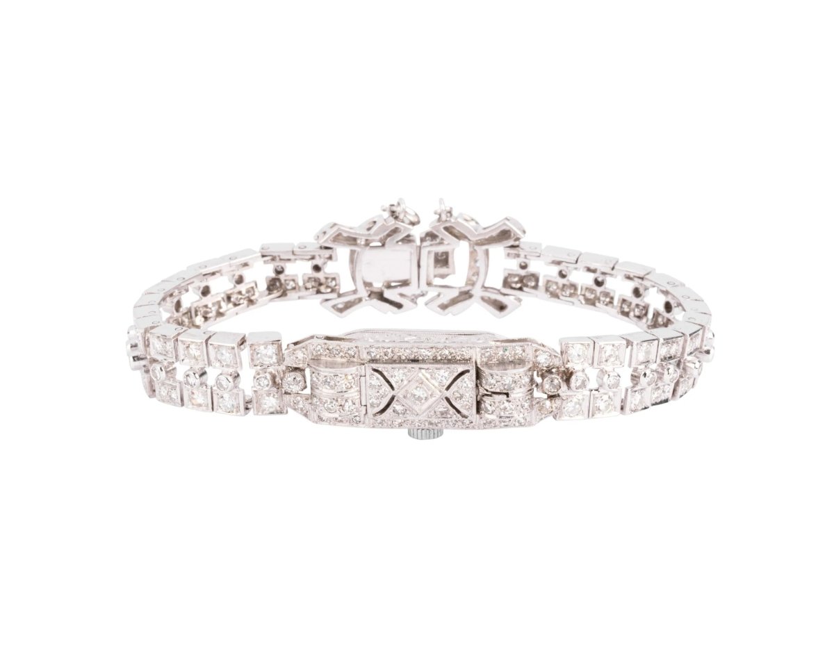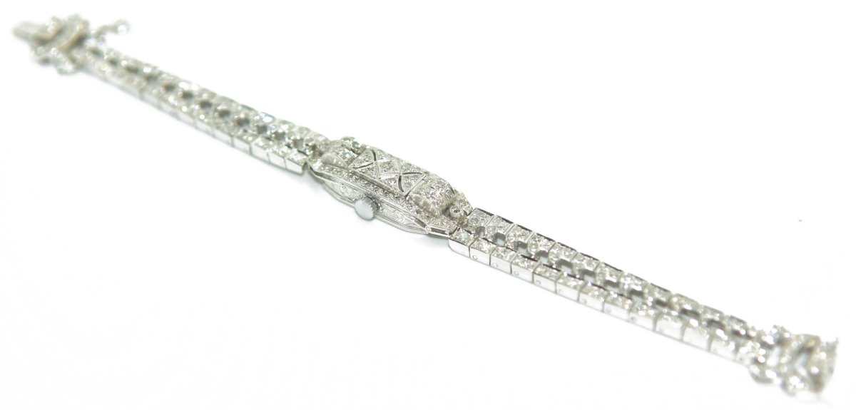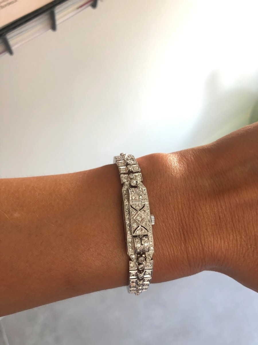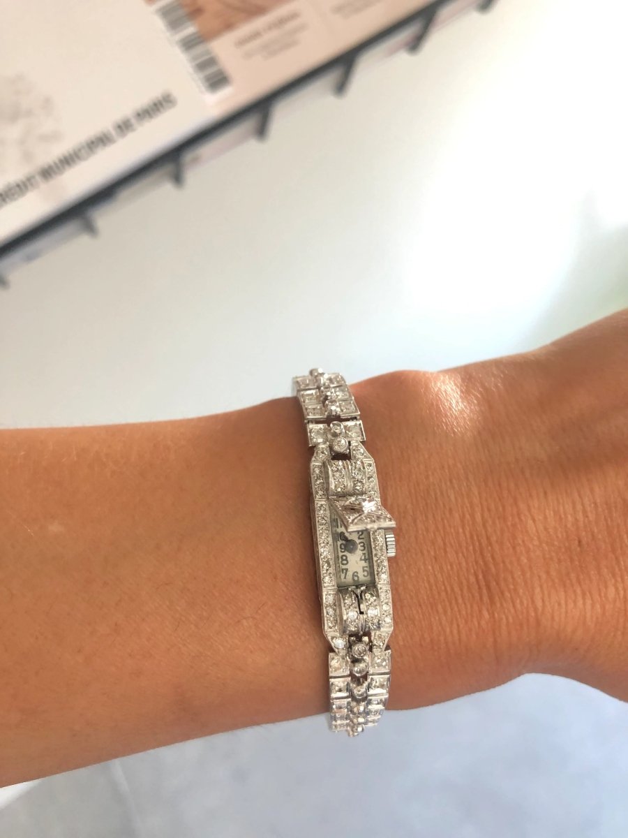 Montre de Dame Art déco en platine Lunette et une partie du bracelet sertie de diamants taille 8/8 et taille ancienne totalisant environ: Mouvement mécanique révisé La montre est délicatement caché par un couvercle serti de diamant. Matière : Platine et Or gris Poinçon : tête d'aigle et tête de chien Poids : 38,8grs Longueur : 16 cm Largeur : 1cmNombre de pierres: 185Total Carat: 5,5 cts Période: 1930