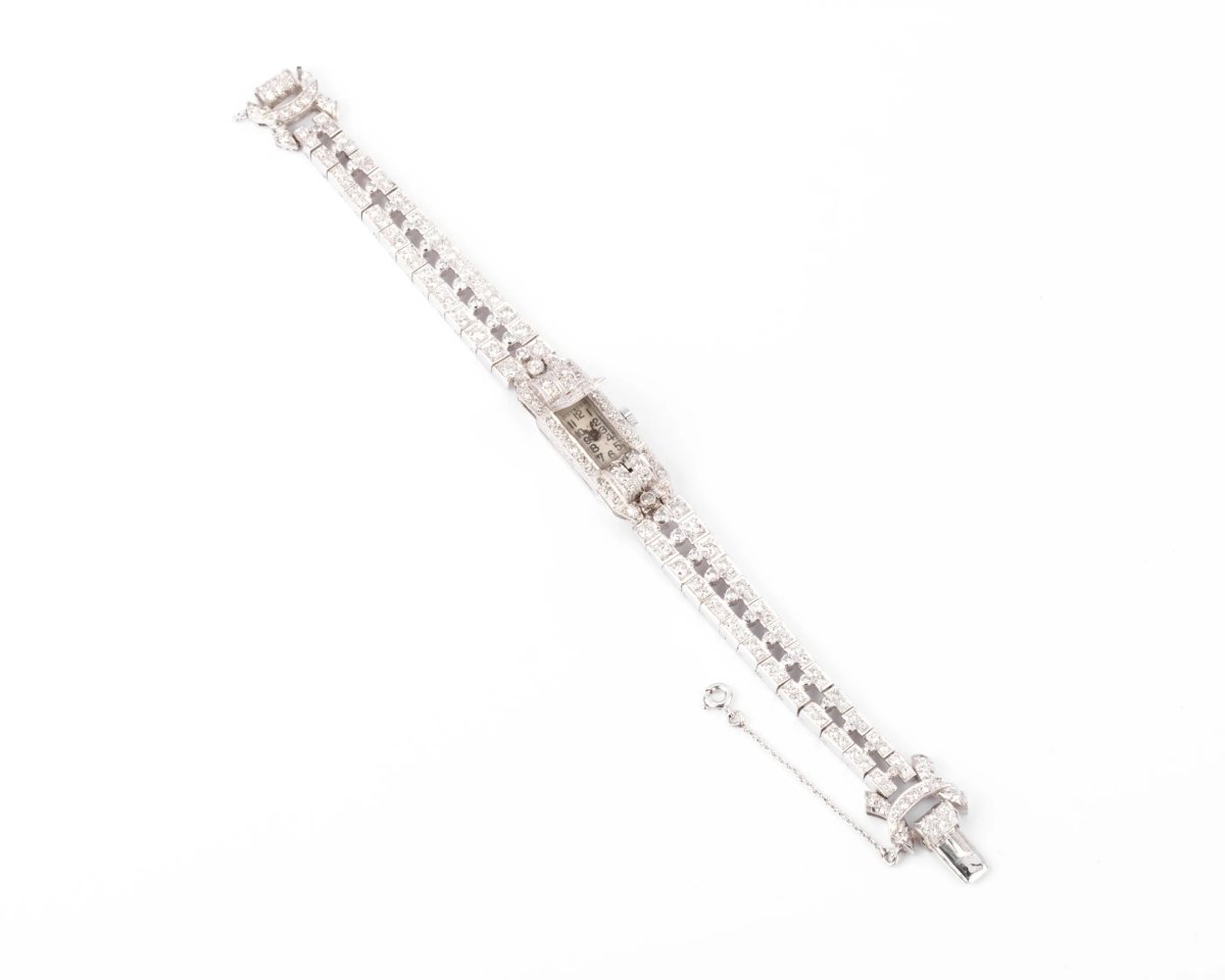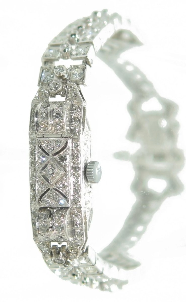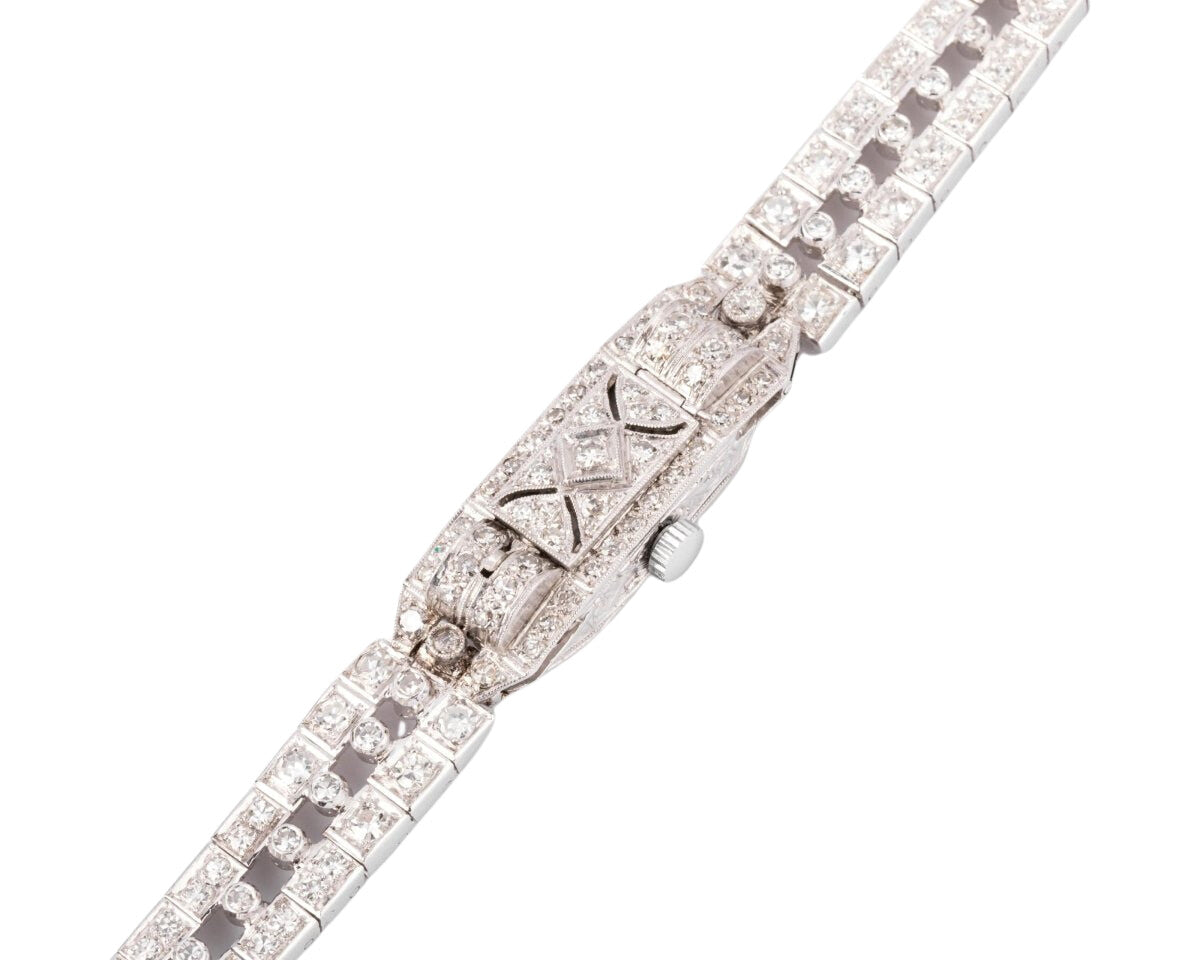 Montre de Dame Art déco en platine Lunette et une partie du bracelet sertie de diamants taille 8/8 et taille ancienne totalisant environ: Mouvement mécanique révisé La montre est délicatement caché par un couvercle serti de diamant. Matière : Platine et Or gris Poinçon : tête d'aigle et tête de chien Poids : 38,8grs Longueur : 16 cm Largeur : 1cmNombre de pierres: 185Total Carat: 5,5 cts Période: 1930