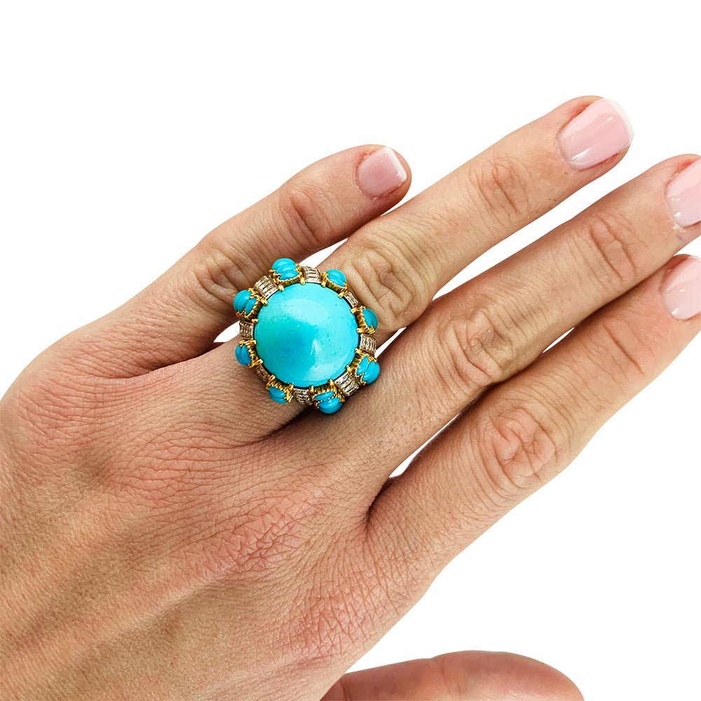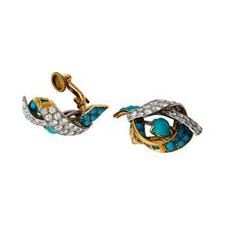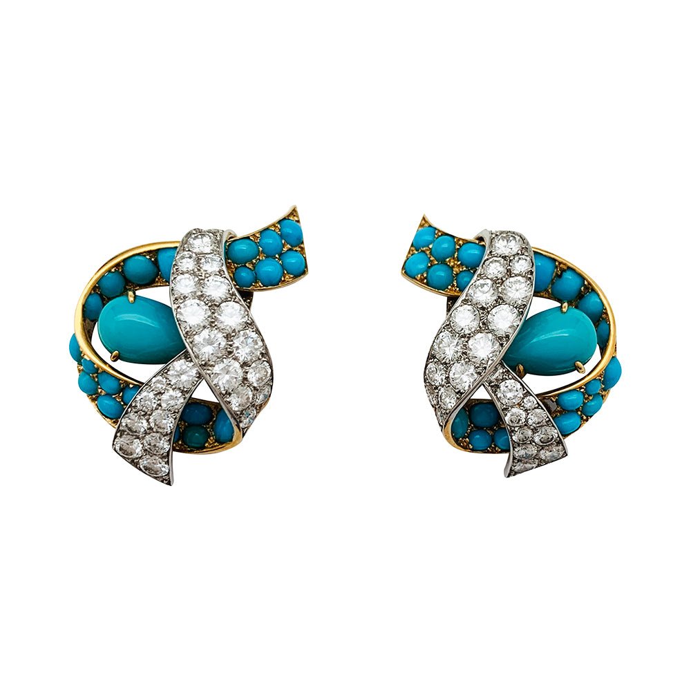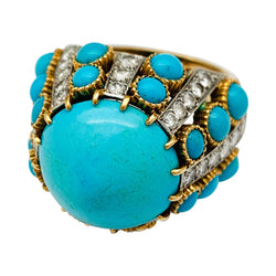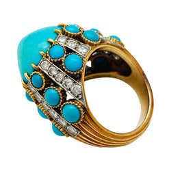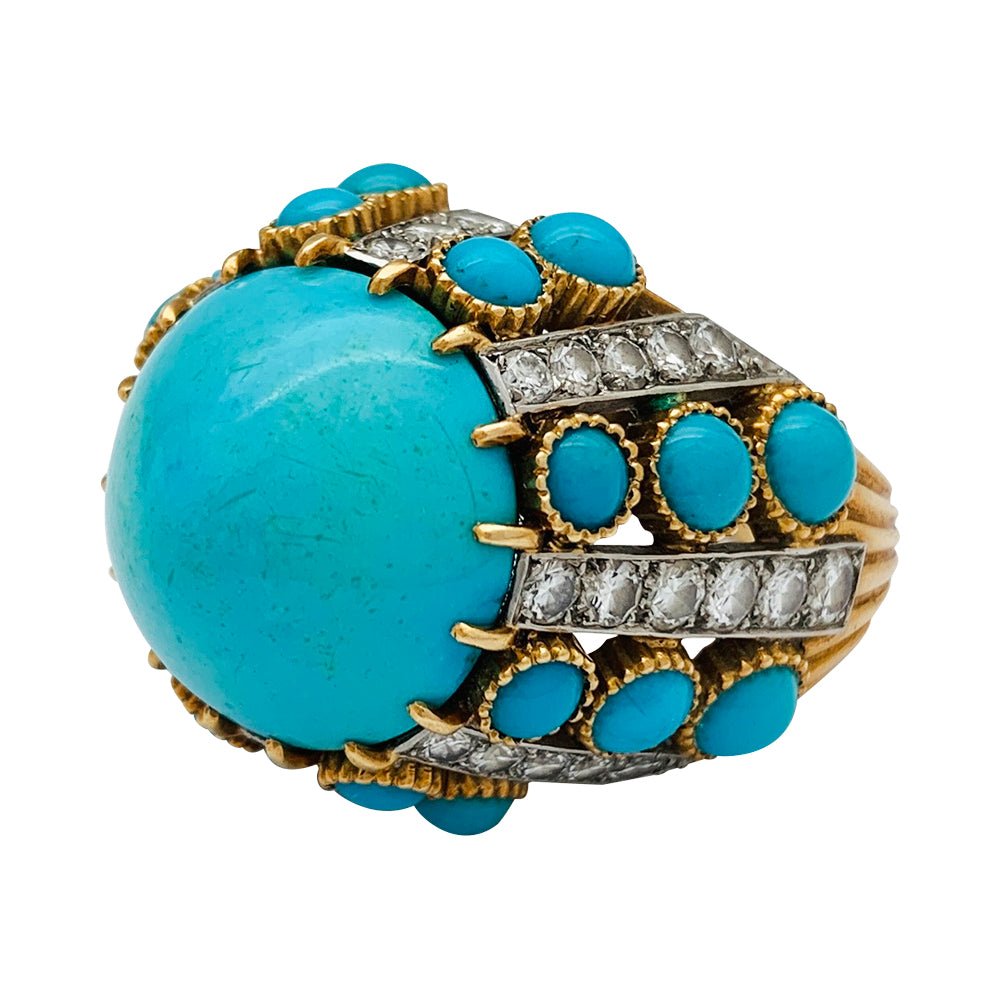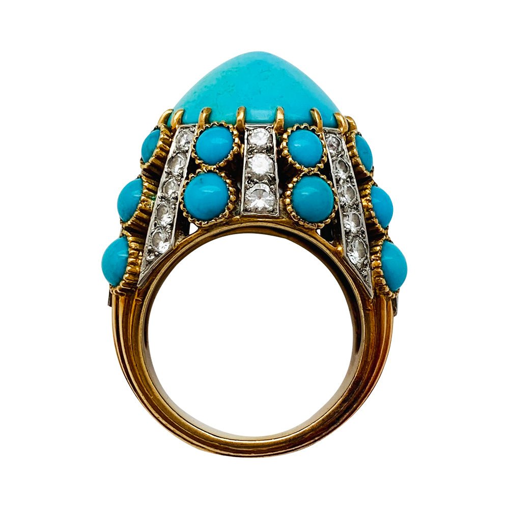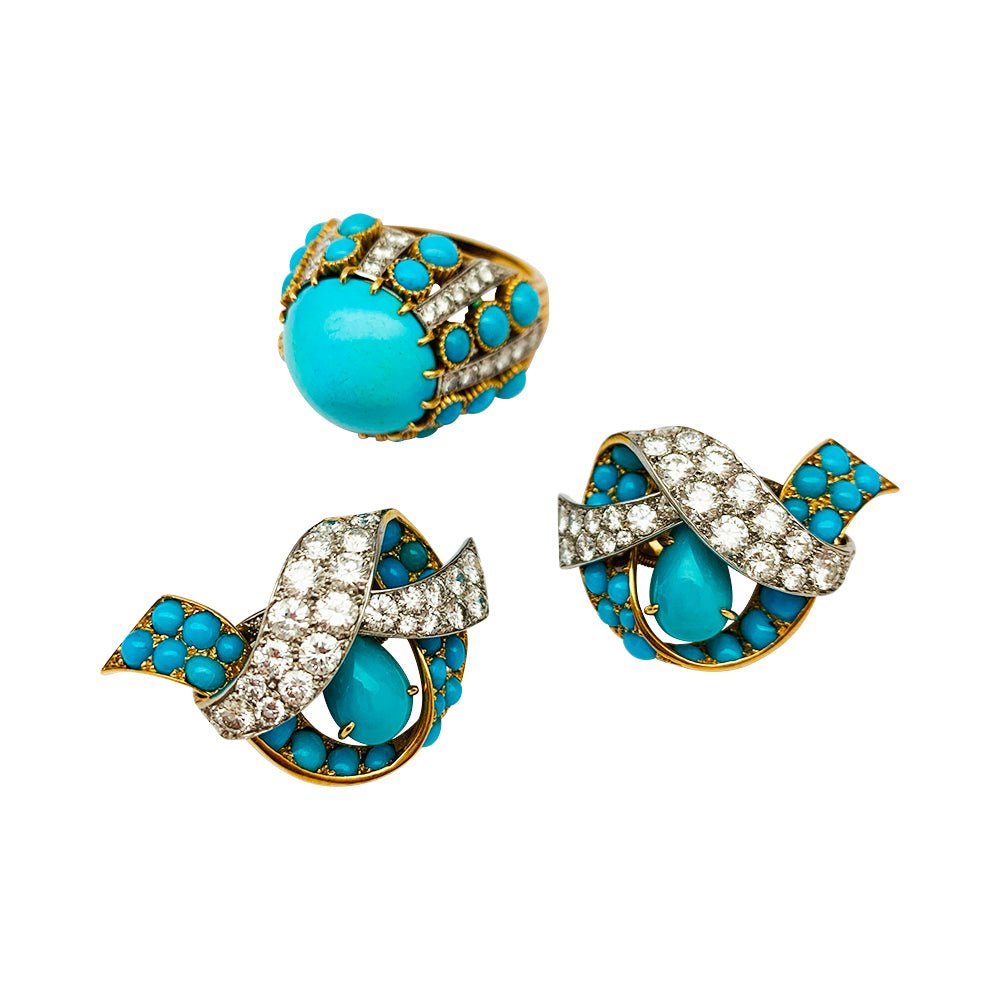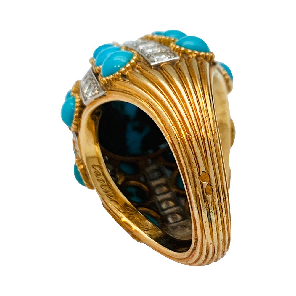 Une parure vintage signée de la Maison Cartier composée de : Une paire de boucles d’oreilles signée Cartier Paris en or jaune 750/000 et platine 950/000 formant des volutes serties de cabochons de turquoise et de diamants taille brillant. Une bague signée Cartier Paris de forme 'Dôme' en or jaune 750/000 centrée d'un important cabochon de turquoise, la monture à décor de lignes de turquoises et de diamants taille billant sertis sur platine 950/000. Poids : Boucles d'oreilles : 17,7 grammes. Bague : 16,6 grammes. Tour de doigt : 55