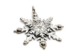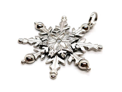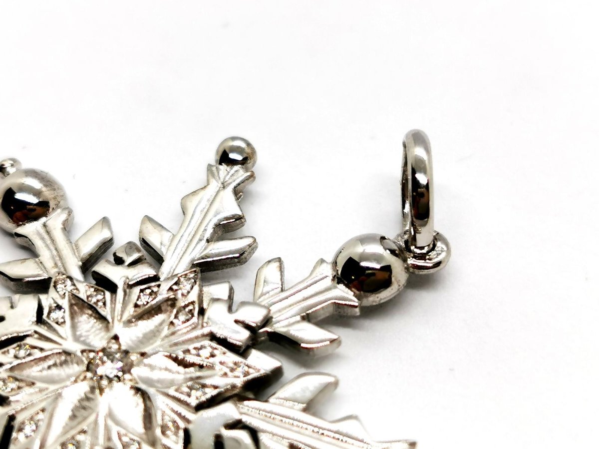 Pendentif en or blanc 750 millièmes (18 carats). motif flocon de neige. signé JP Megève. sertie de 19 diamants taille brillant. dont un diamant central d'environ 0.04 ct. et 18 diamants d'environ 0.05 ct chacun. poids total diamants: environ 0.13 ct. dimensions (bélière incluse): 4.51 cm x 3.83 cm. poids total: 11.11 g. poinçon tête d'aigle. excellent état