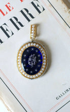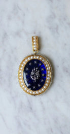 Rare pendentif « Au Firmament », médaillon ouvrant en or jaune 18 Kt (poinçon: tête d'aigle) orné d'émail bleu guilloché à décors de motifs floraux et d'étoiles en argent sertis de diamants taillés en rose dans un double entourage de perles probablement fines. Compartiment secret au dos s'ouvrant avec un système de fermoir ressort, et renfermant un tissu bleu. Verre d'origine au dos. Travail Français du XIXe Siècle. Bélière et médaillon numérotés. Poids brut: 27.56 g Hauteur: 5,80 cm Largeur: 3,30 cm État: très bel état, très légères micro rayures et oxydation des parties or et argent, voir photos.   Et vous, que glisseriez-vous dans ce joli pendentif? Une photo, une mèche de cheveux de l'être aimé, ou une fleur séchée? Tous nos pendentifs anciens.